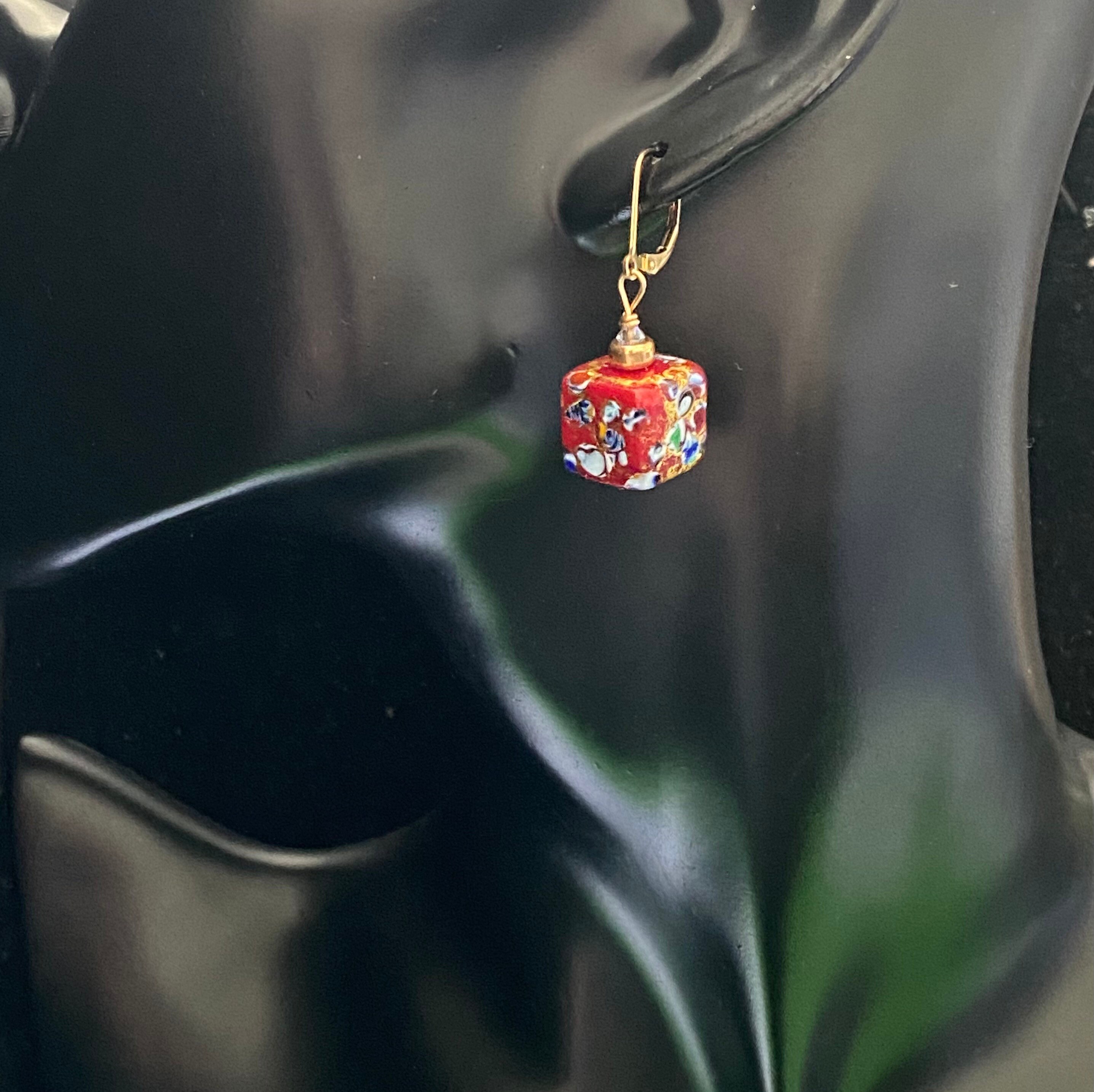 Murano Glass red and gold cube earrings. Klimt tile inspired pattern. Cubes are 12mm. 14 KT Gold filled lever back hooks and beads.