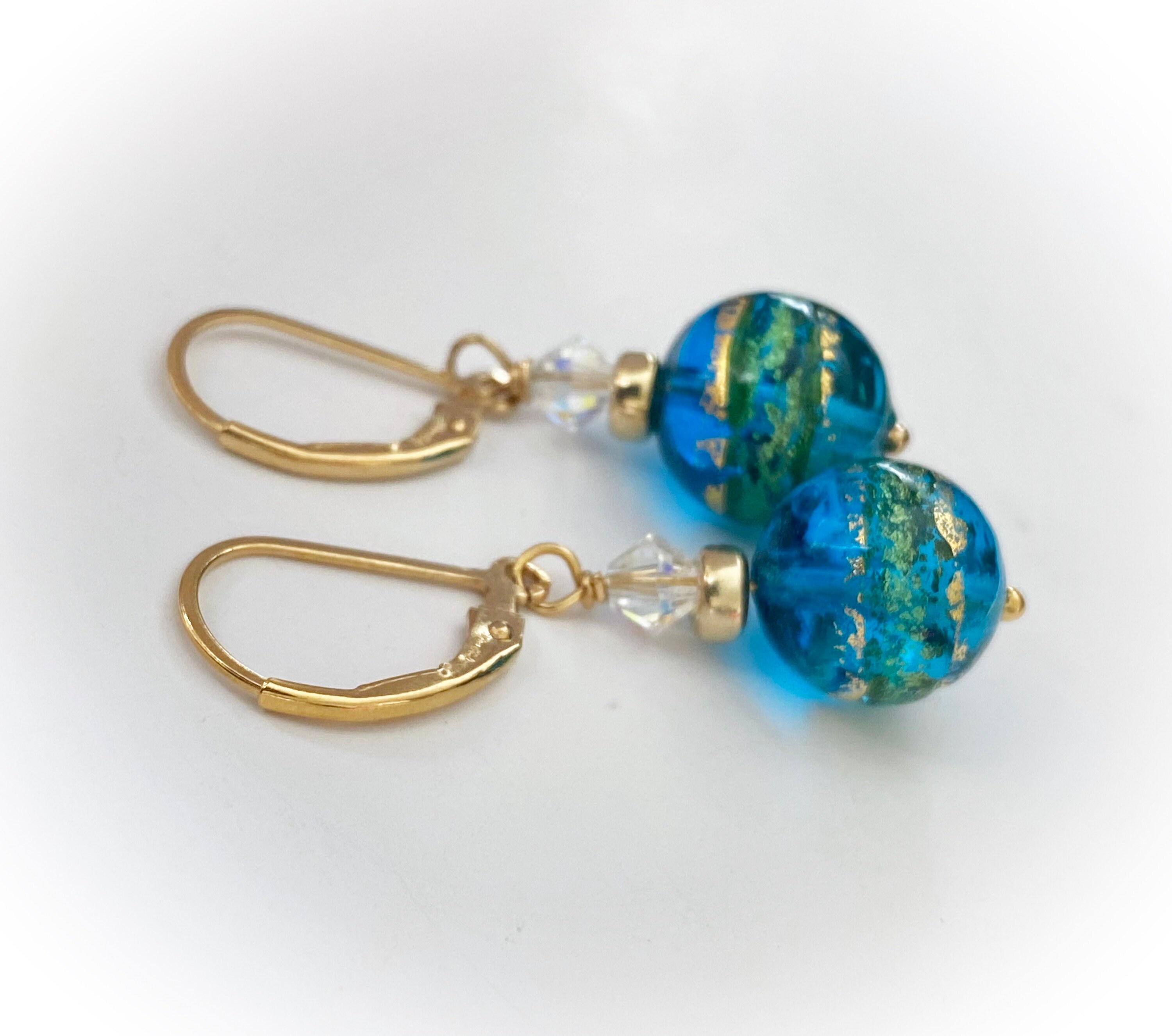 Authentic Murano Glass 10 mm bead earrings hang on 14 Karat Gold Filled lever back hooks. 14 Karat Gold Filled and Austrian Crystal accent beads. One of a kind.
