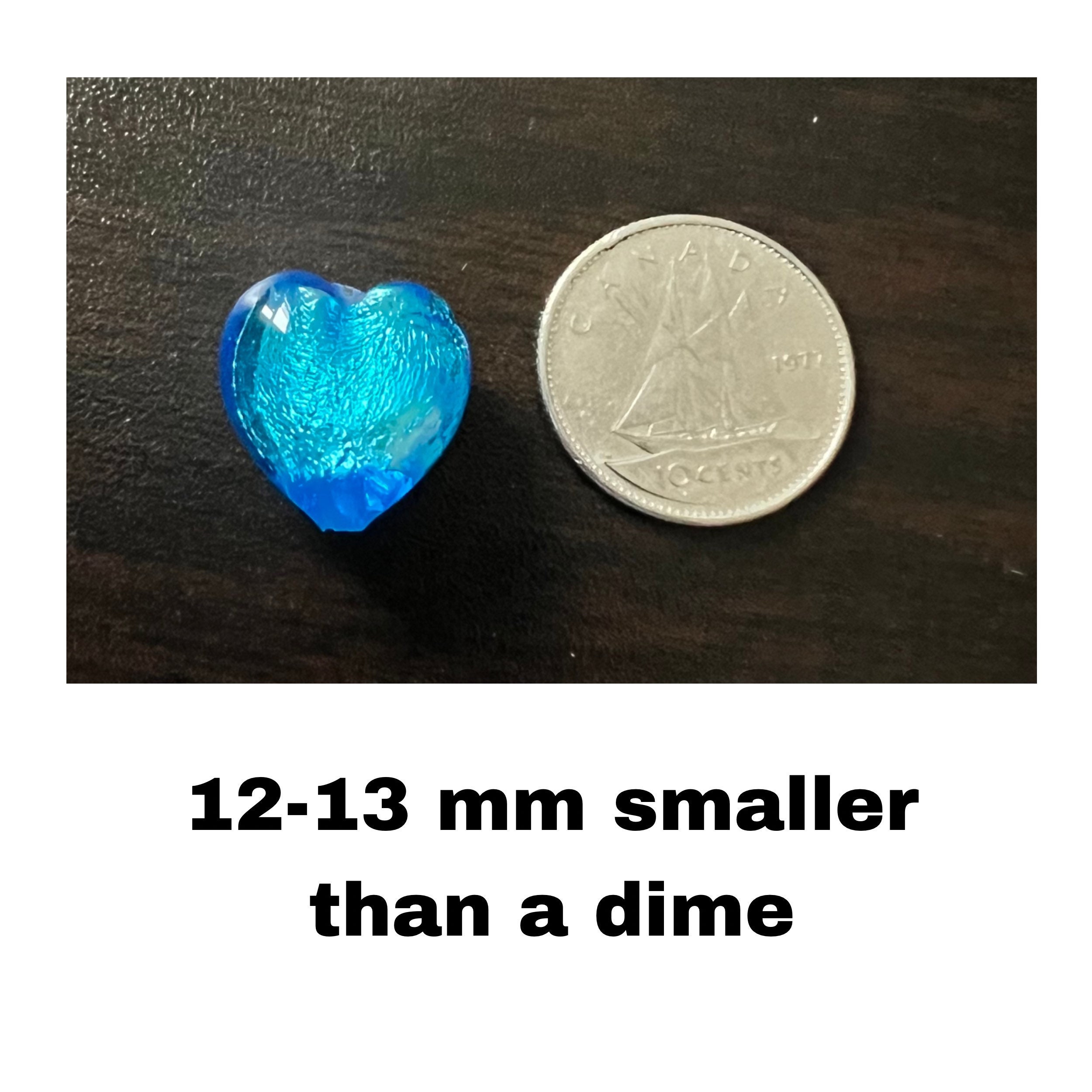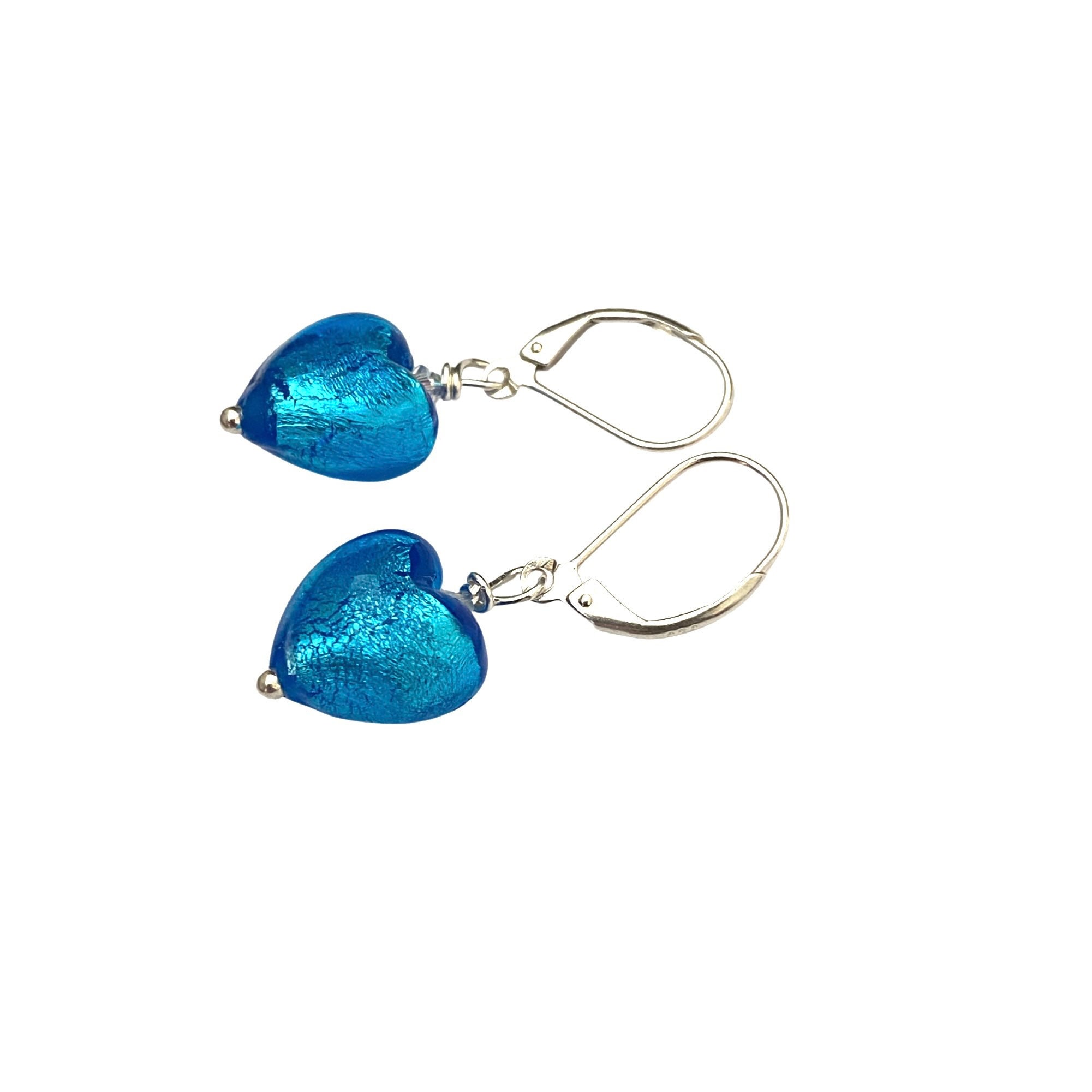 Deep turquoise puffy heart earrings. White 24 karat gold foil and pigment colour painted on to transparent blue glass. Sterling Silver lever back hooks. Austrian Crystal beads. Slightly smaller than a dime ( about 1/2 inch) but puffy.