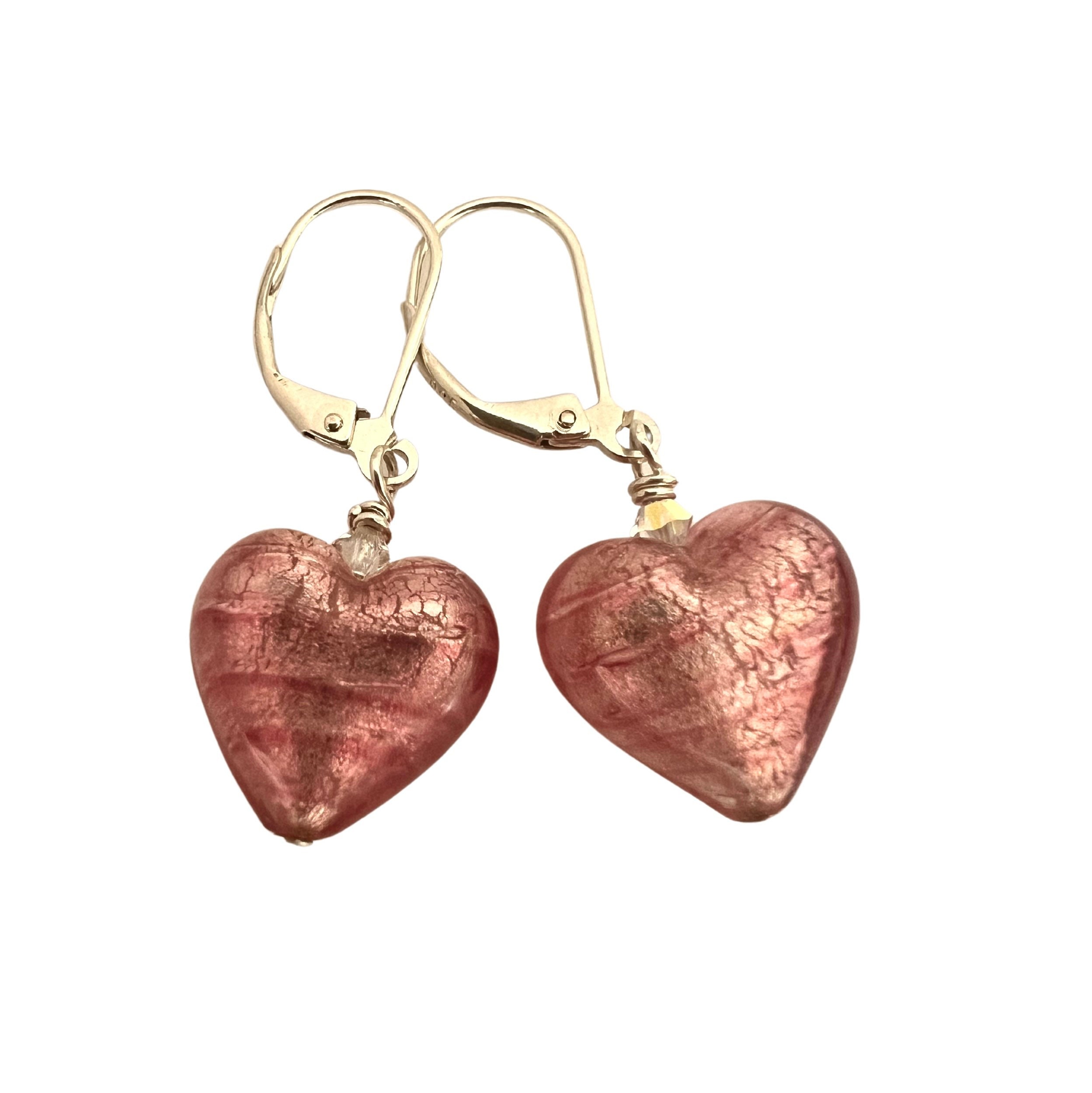 Pink genuine Italian Murano Glass heart earrings. Real karat white gold leaf foil. Austrian Crystal bead and 925 Sterling Sterling Silver lever back hooks. Size smaller than a dime 12mm- less than half an inch.