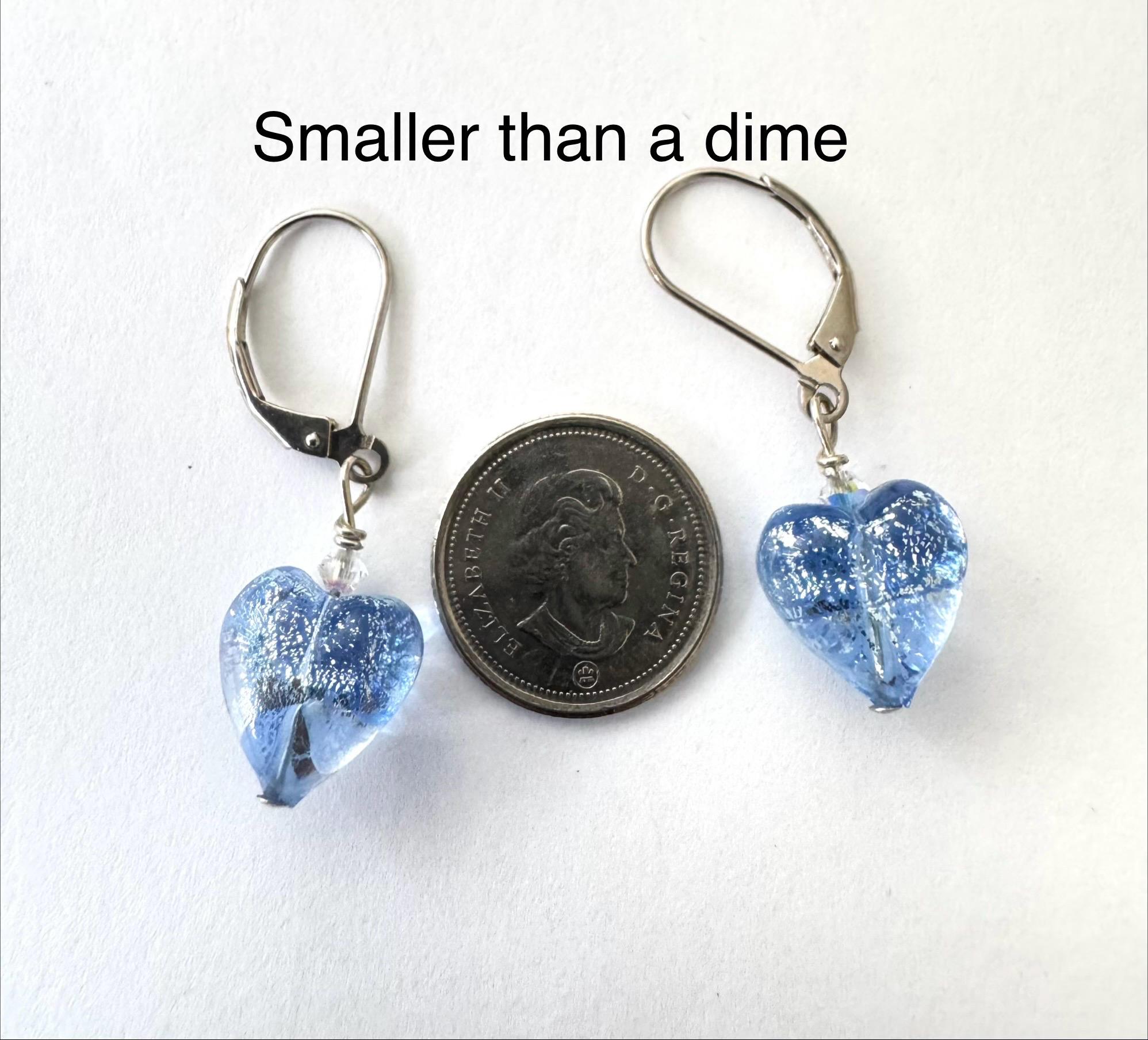 Very small Silver blue Dichroic Murano Glass heart earrings. Size: 12mm ( smaller than a dime coin)- less than a half inch. Hang on Sterling Silver lever back hooks with Swarovski Crystal bead accents.
