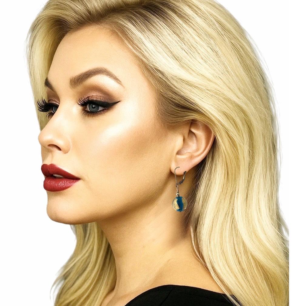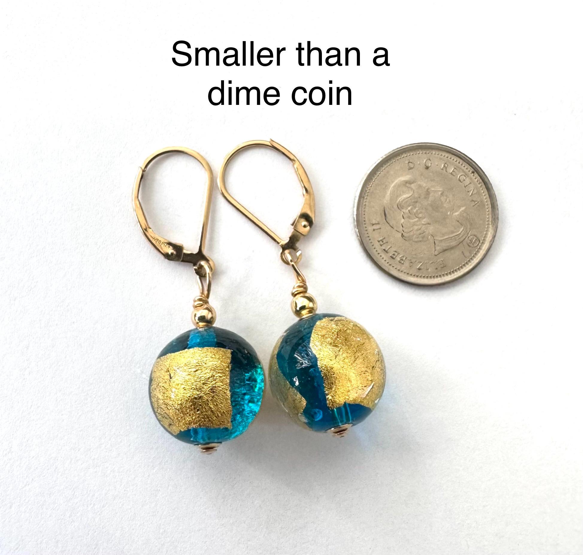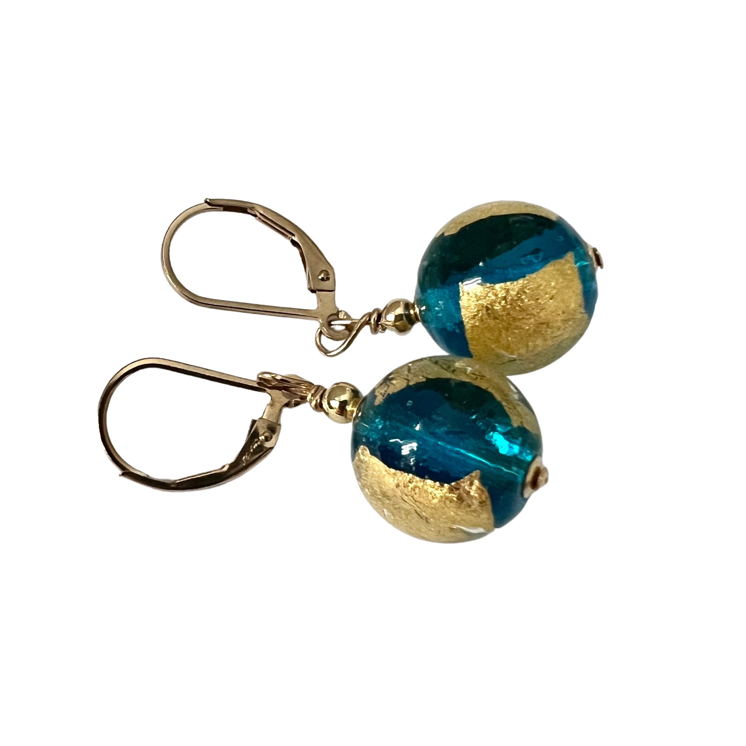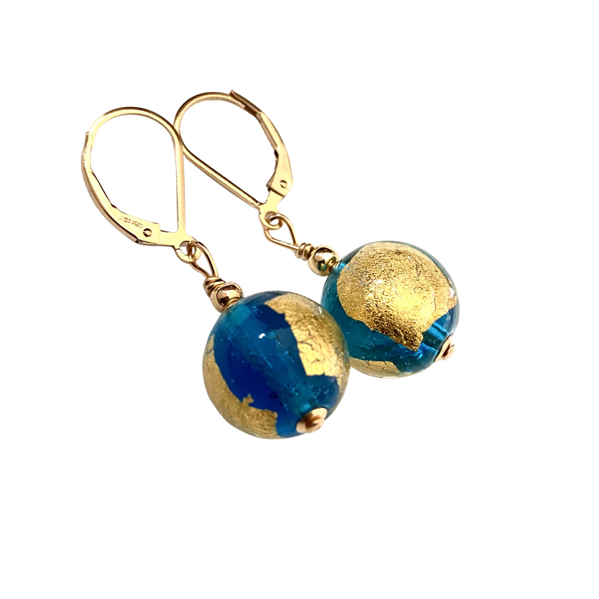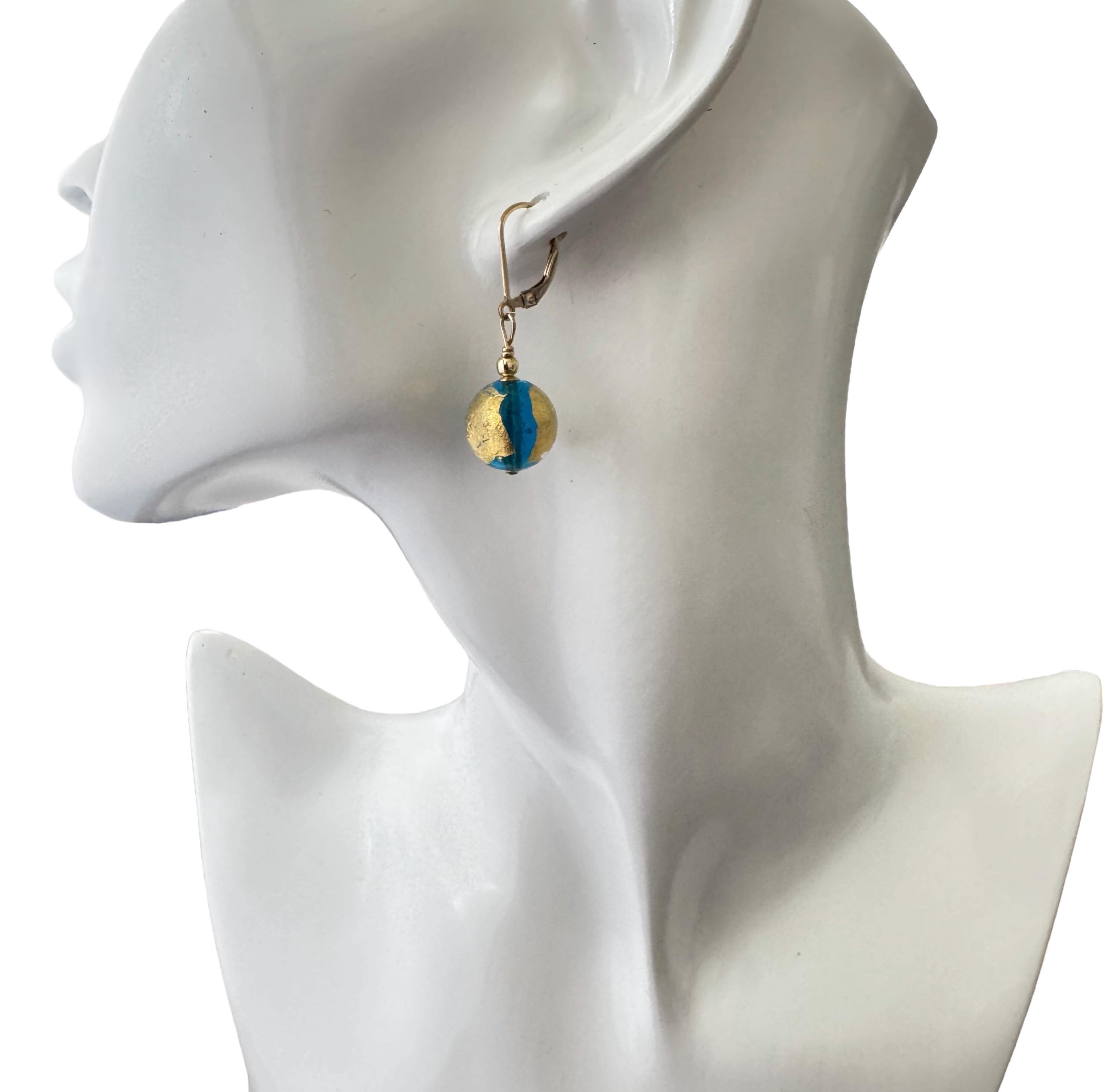 Gold Blue Bead Earrings. Large Murano Glass Bead Balls 14mm (1/2 inch). 14 KT Gold filled accent beads and lever back hooks. 24 KT Gold foil is painted on the outside of the stunning Venetian Glass.