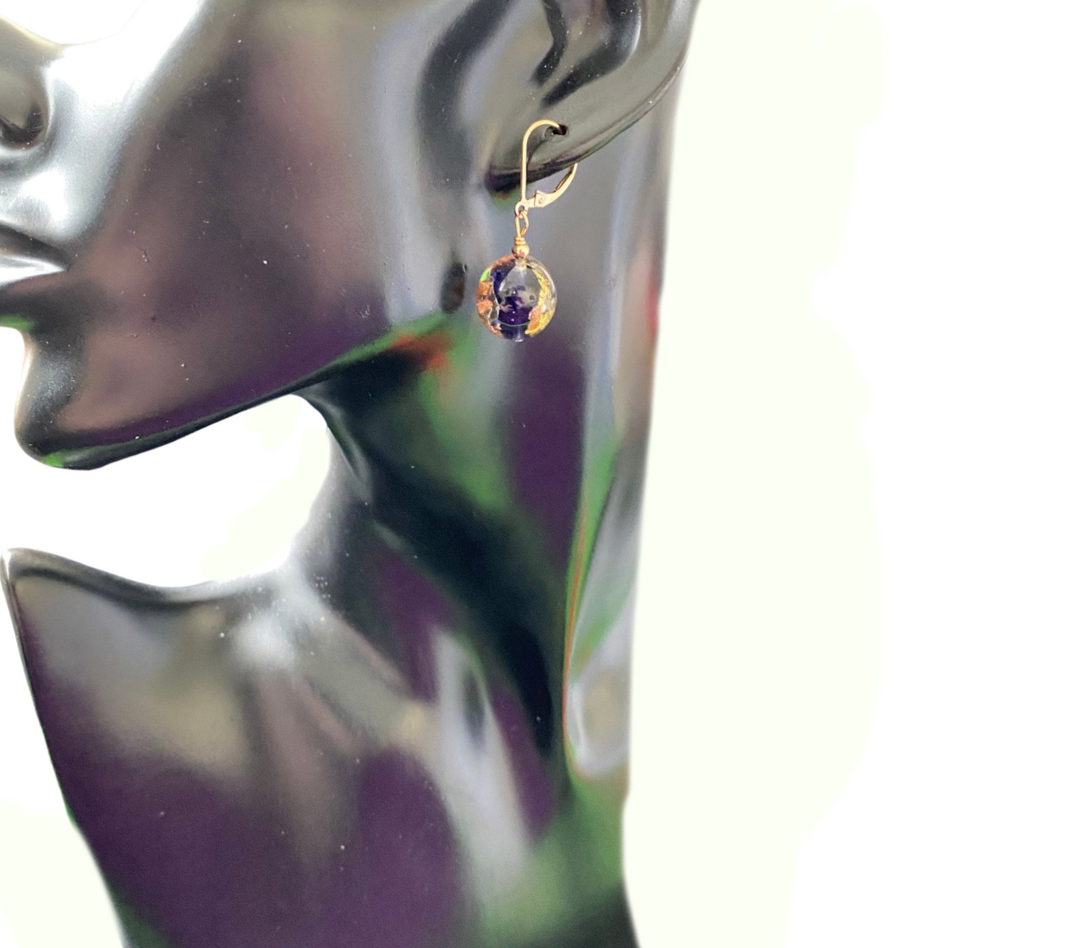 Large Purple Murano Glass bead fused inside with splashes of white, rose and yellow gold foil. The balls are 1/2 inch (14mm). 18 KT Gold Sterling Silver back hooks or Sterling Silver - choose.