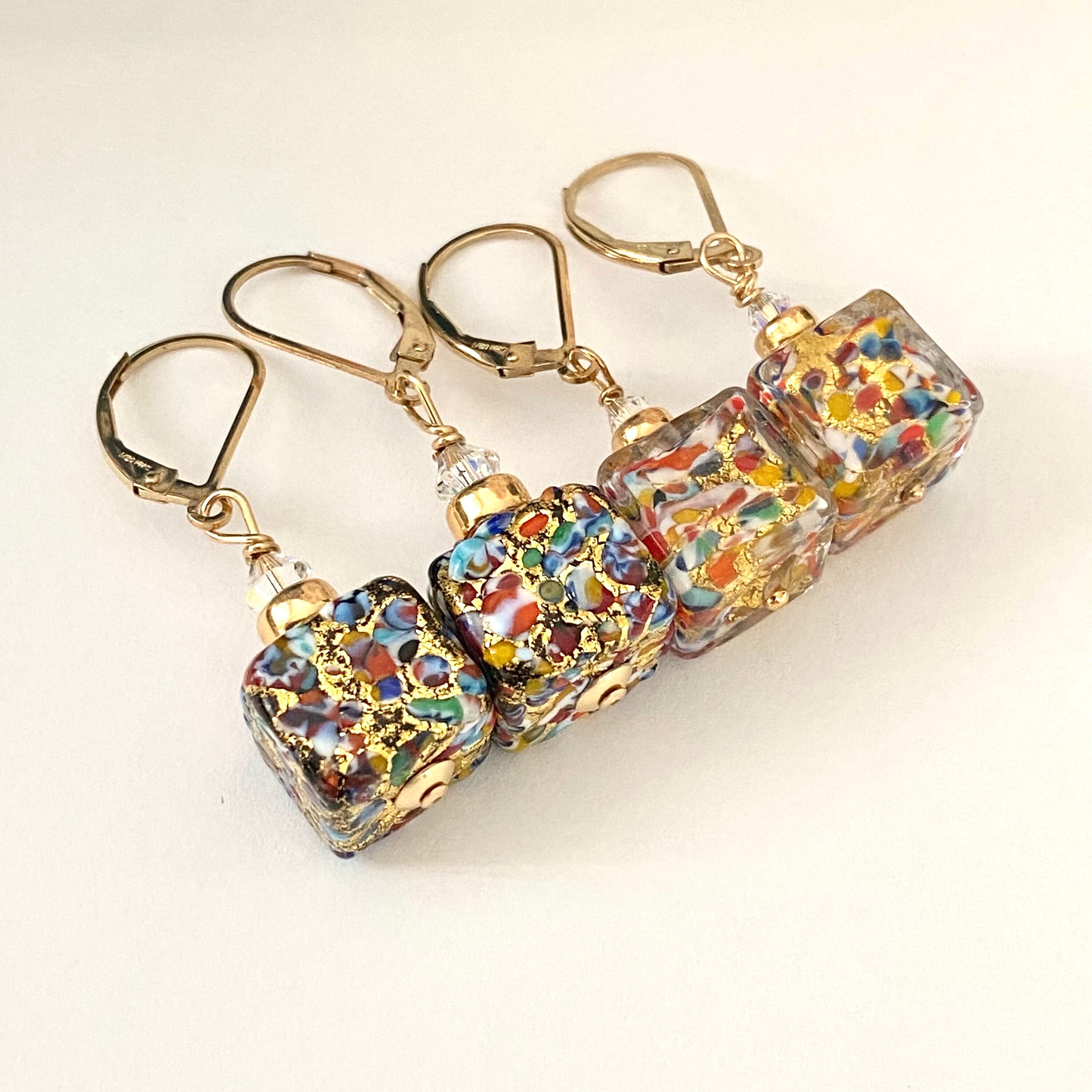 Very small Murano Glass Klimt inspired cubes. Only 10 mm in size these earrings are dainty but beautiful. They are fused with real 24 KT Gold foil. Lever back hooks and beads are 14 KT Gold fill and accent beads are Crystals.
