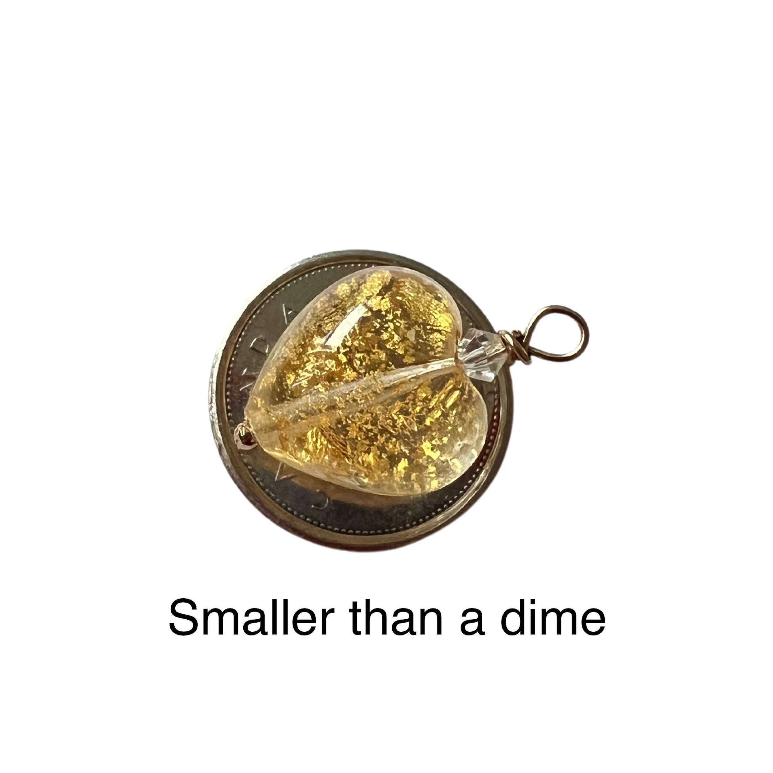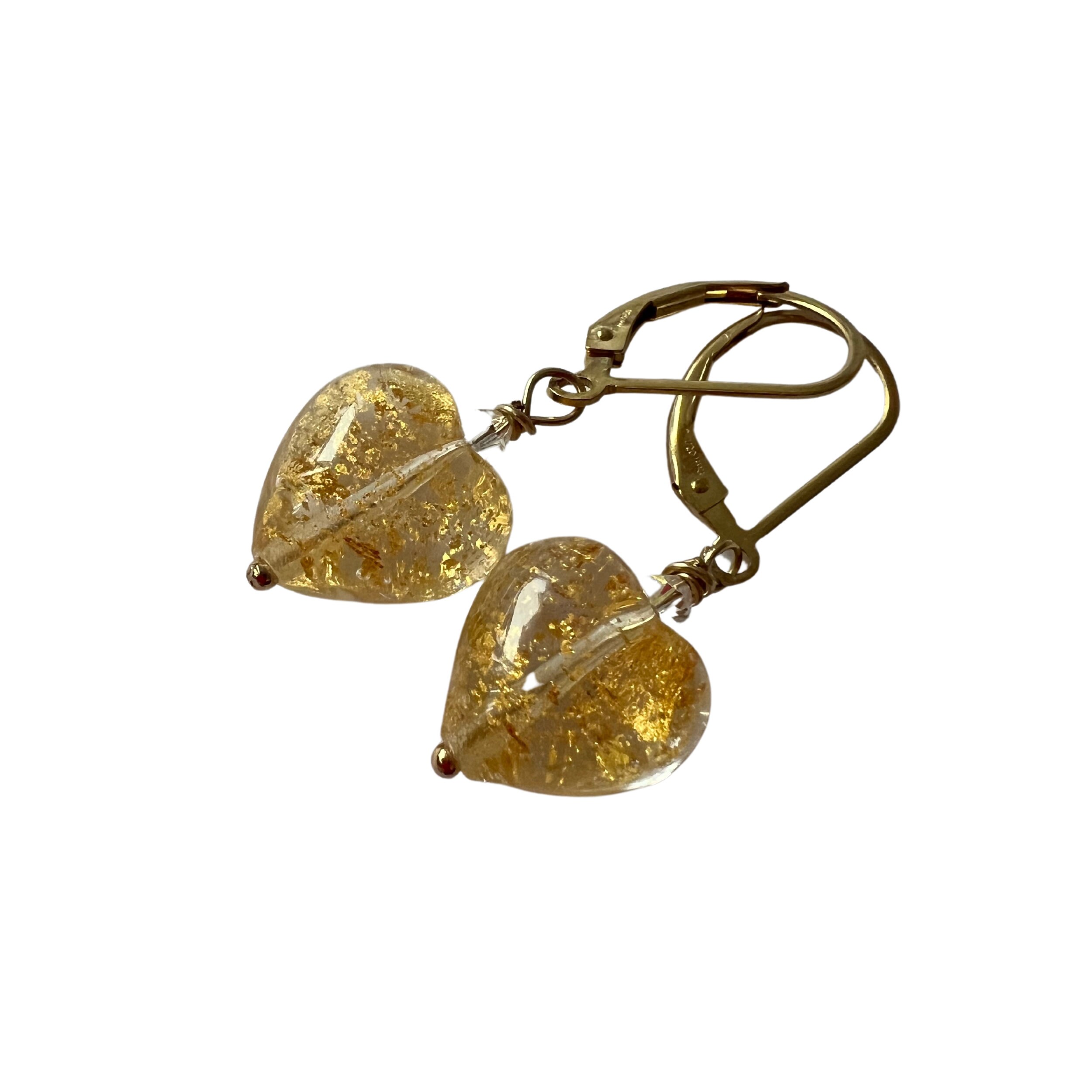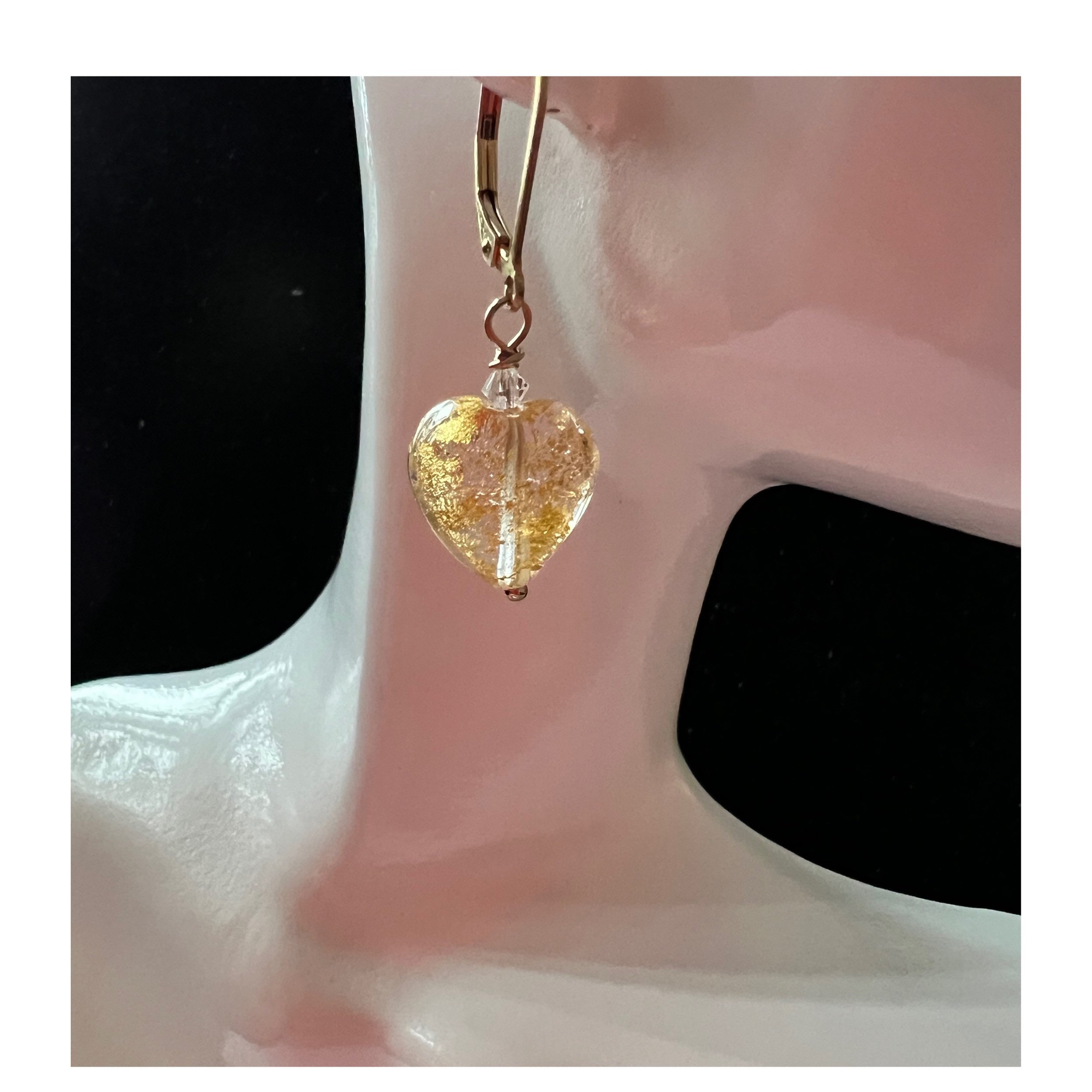 stunning glittering gold Murano Glass heart earrings. Yellow gold transparent glass fused with specs of real 24 KT karat gold foil throughout. Hang on 14 KT Gold lever back hooks with a Austrian Crystal bead accent. Size: 13mm ( smaller than a dime coin) - less than 1/2 inch.