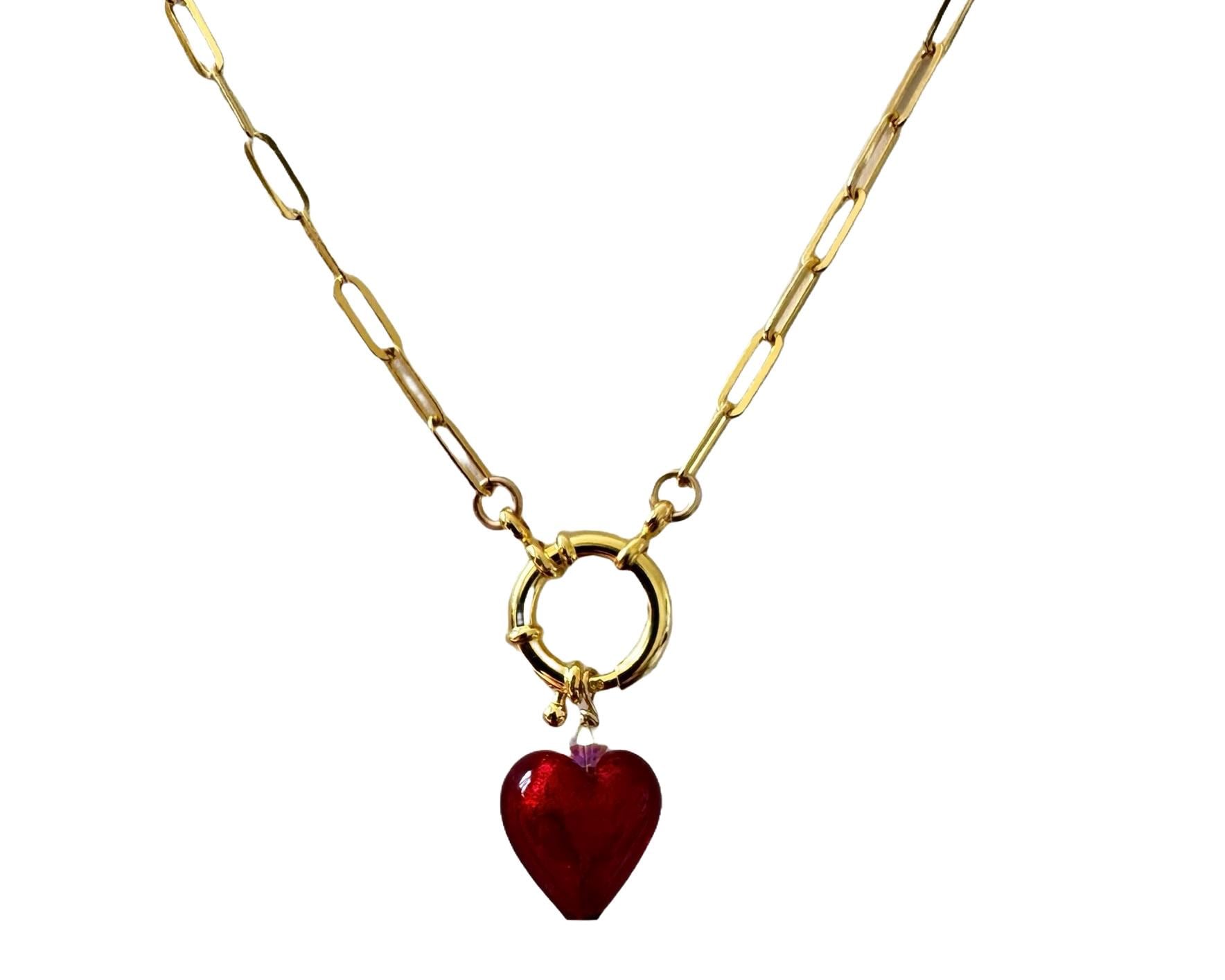 US Tariffs paid by us - no extra $$ Versatile 18 KT Gold dipped Sterling Silver Paperclip chain with a Murano Glass heart is 14mm ( 1/2 inch). Gold Sterling Silver Anchor clasp is 15mm. Austrian crystal accent bead.