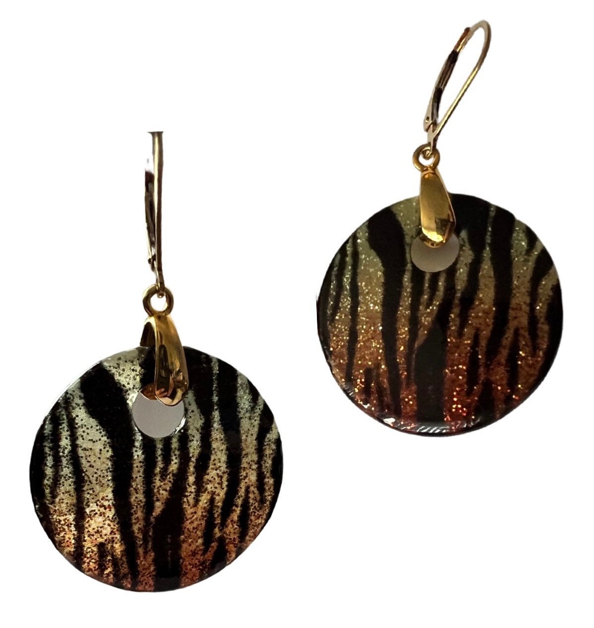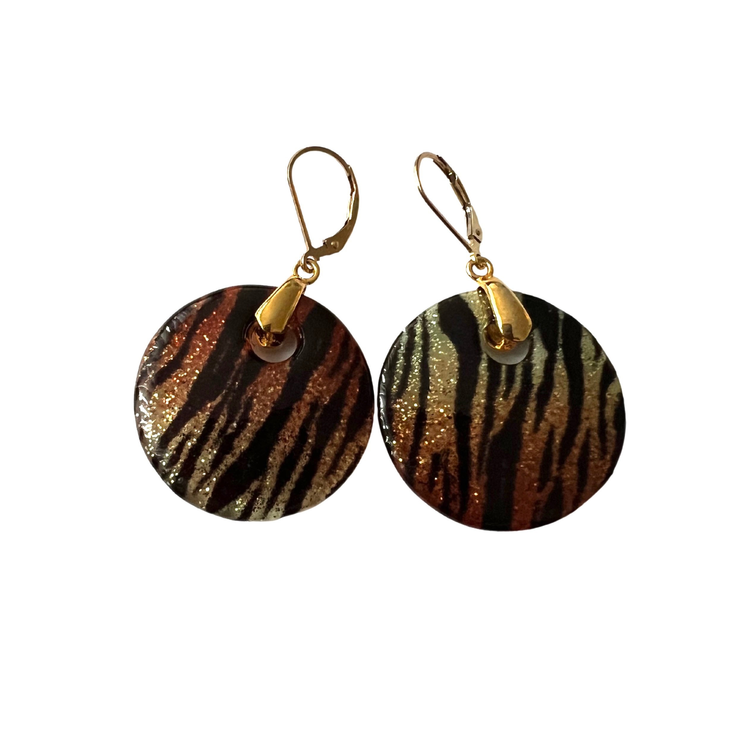 Round Tiger print earrings. Sparkling fused Murano Glass 25 mm ( 1 inch) hang on 14 KT Gold filled lever backs and 24 KT Gold Sterling Silver bails.