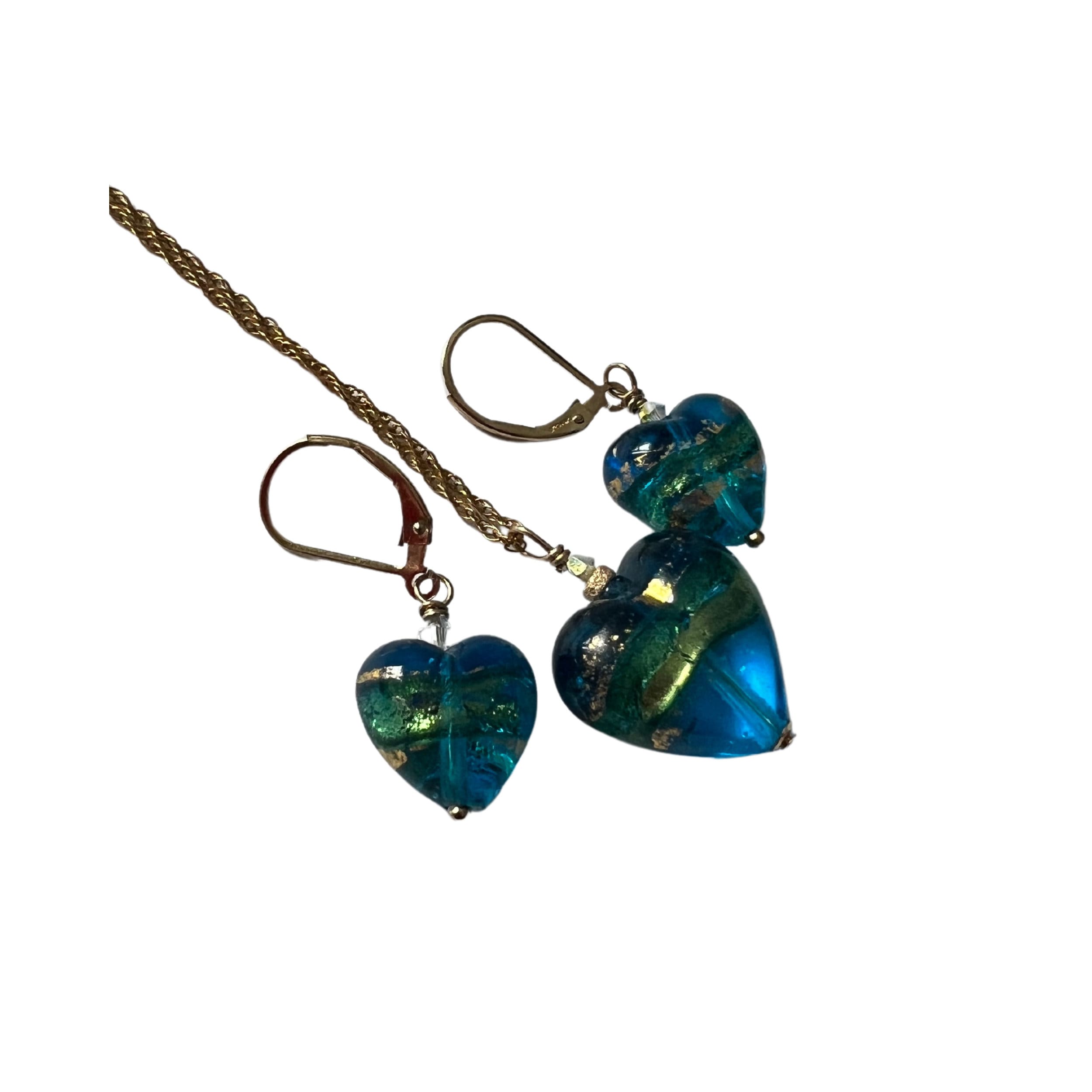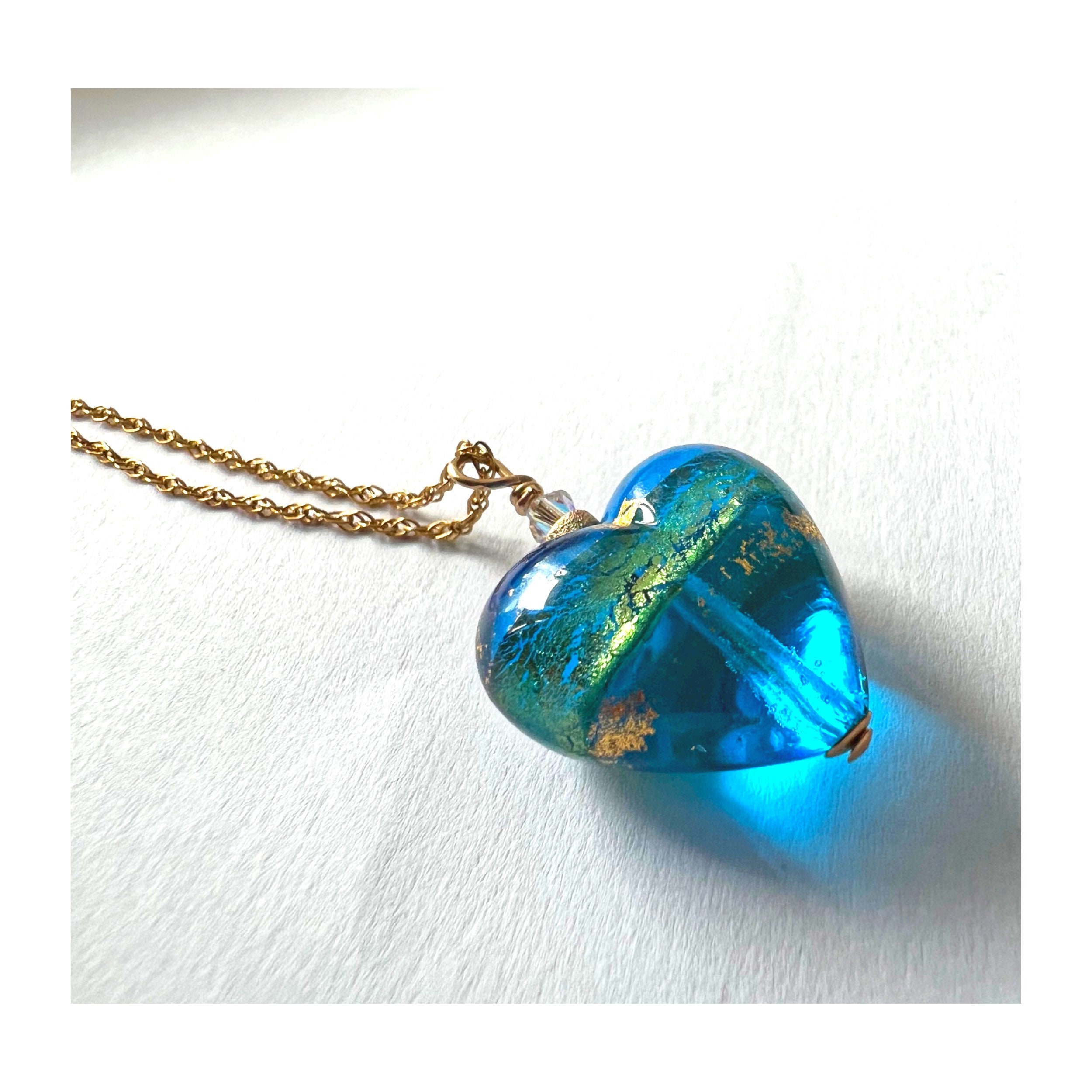 Small Teal Blue striped genuine Murano Heart. A crystal bead enhances the beautiful sparkling heart. Handmade and wire-wrapped. Medium size available. Matching earrings listed. Hangs on an 18 KT Gold dipped Sterling Silver chain.