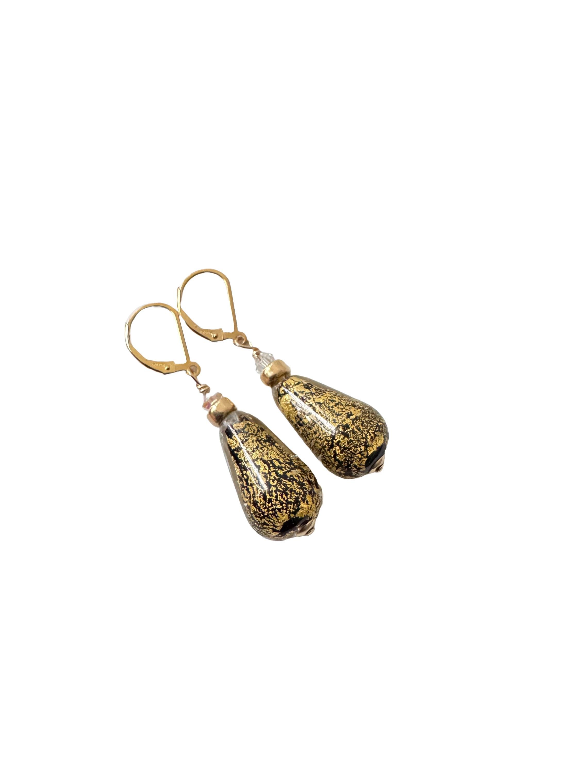 Elegant long Black with 24 KT gold leaf glitter- genuine Murano Glass teardrops (25 mm) with 14 KT Gold-filled and Swarovski Crystal accents. 24 Karat Gold is fused in the blue transparent glass teardrop. They hang on 14 KT Gold filled lever back clasps. Sparkling in light…