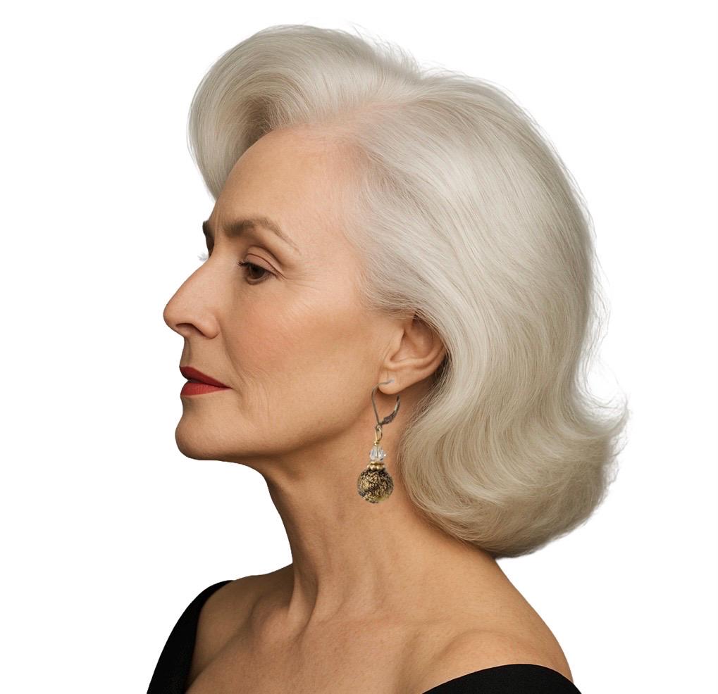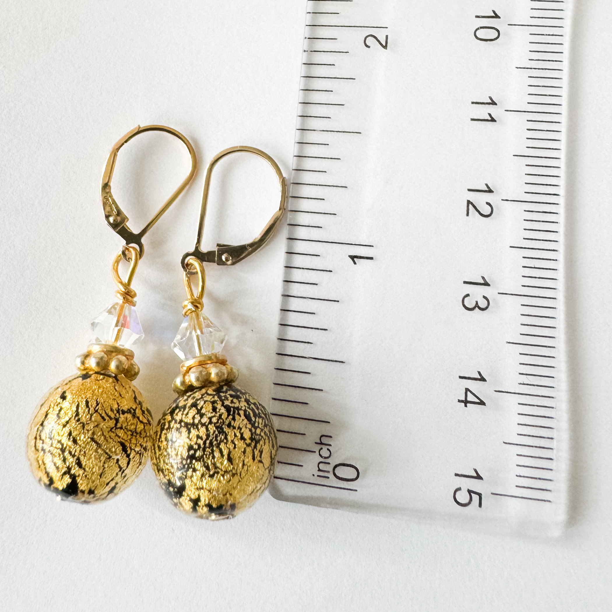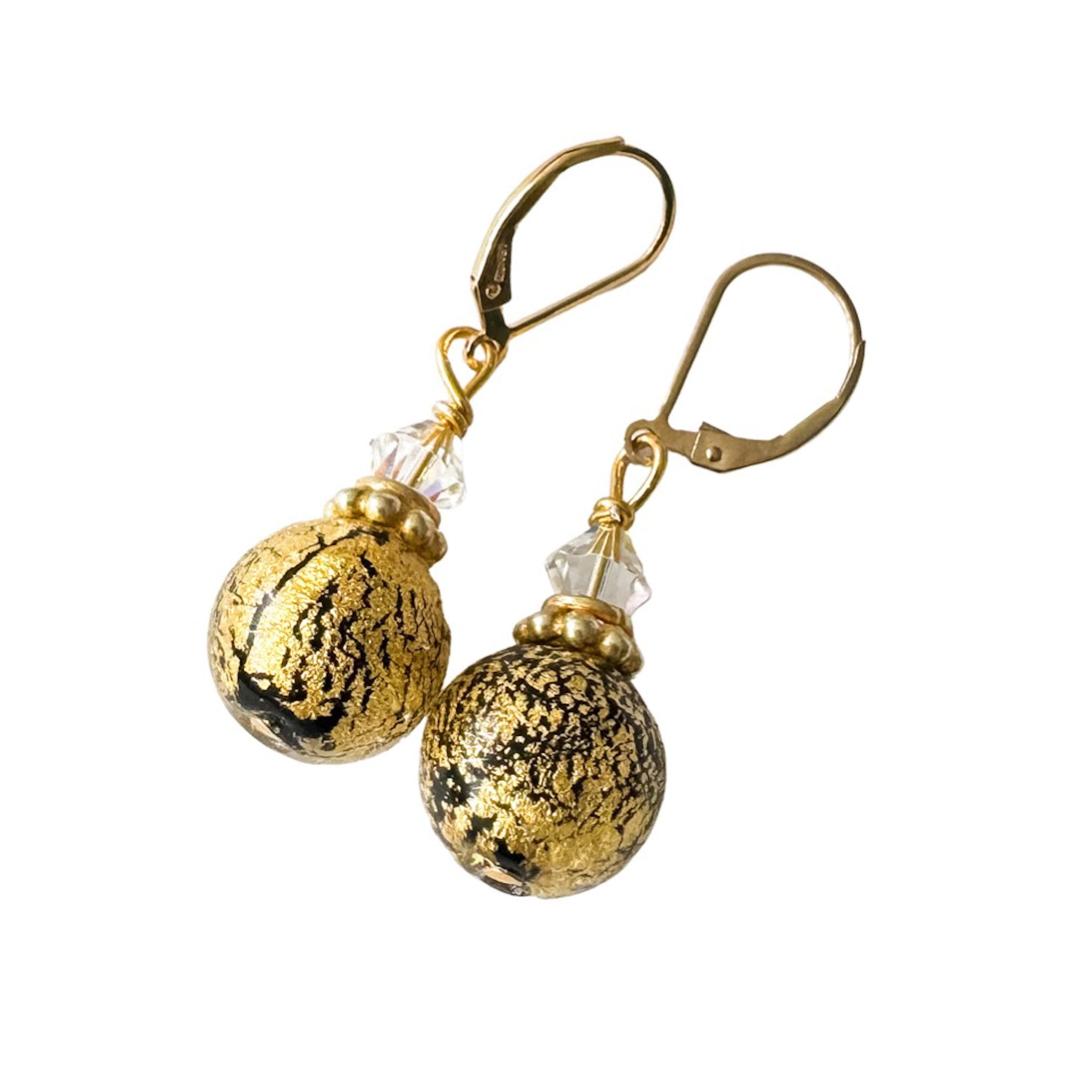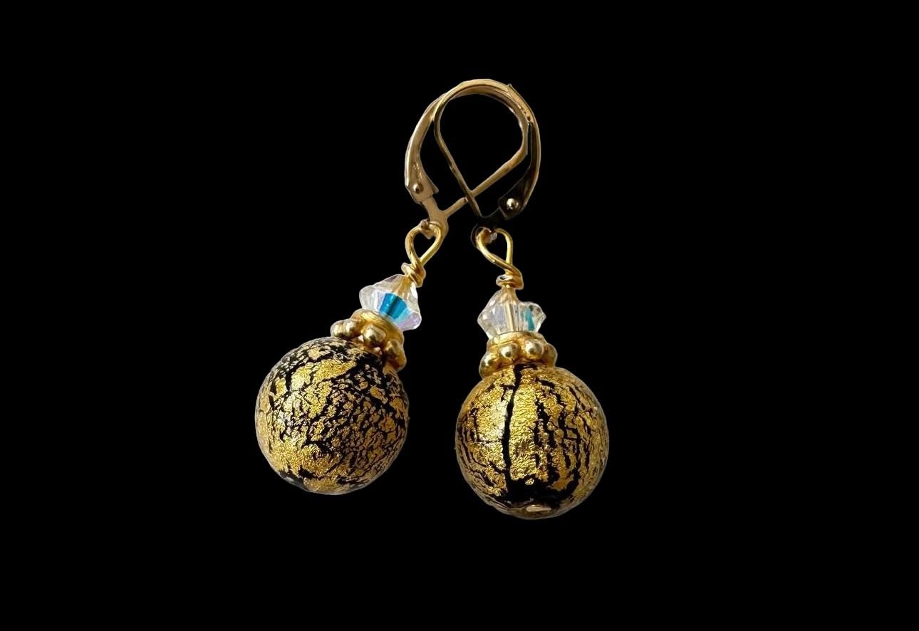 Sparkling Black transparent Murano Glass fused with 24 KT yellow Gold bead (10-11mm) earrings. They hang on 14 KT Gold Filled lever back clasps. Accented with ornate Gold Vermeil bead caps and Austrian Crystal bicone beads. One of a kind piece.