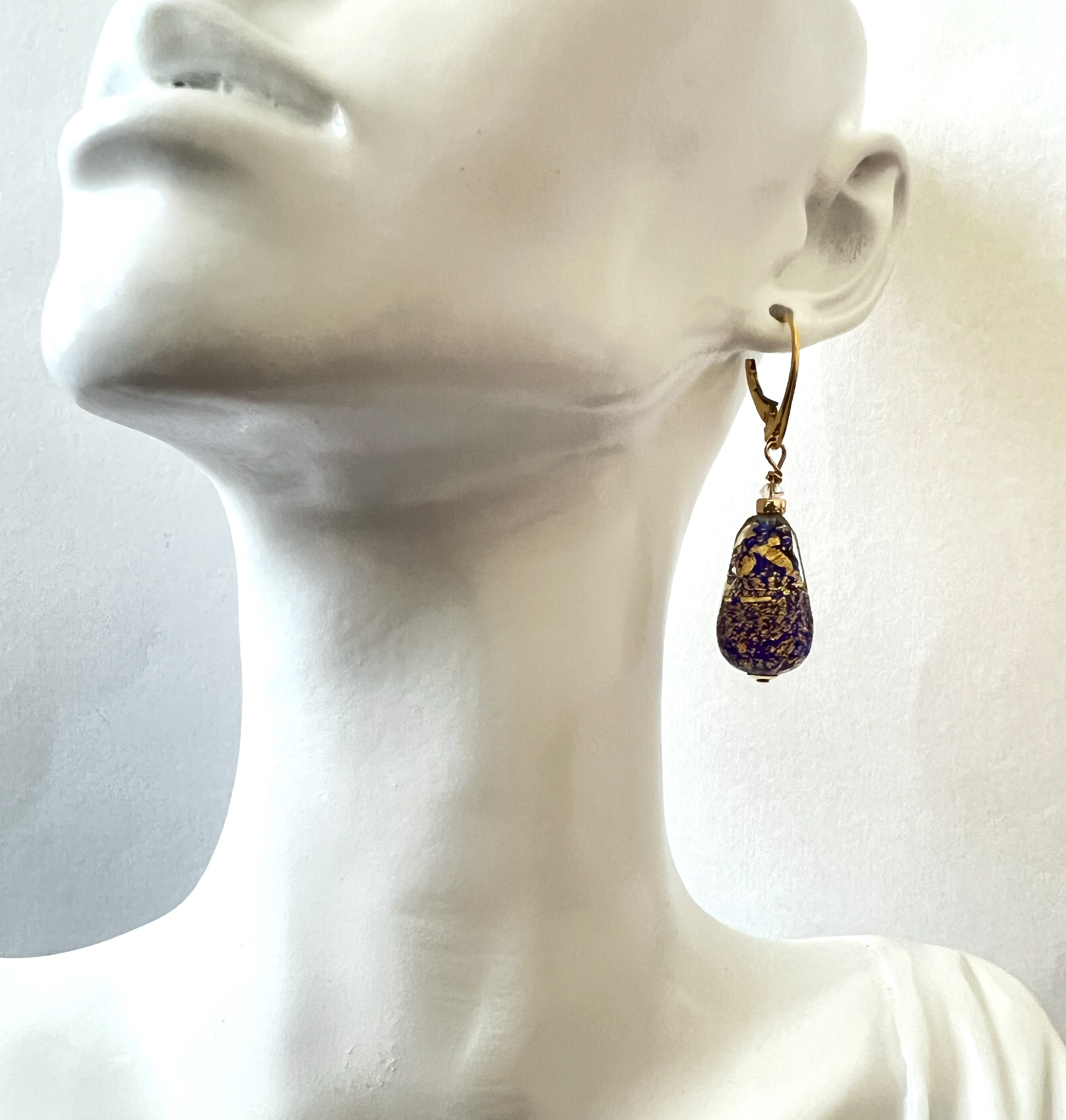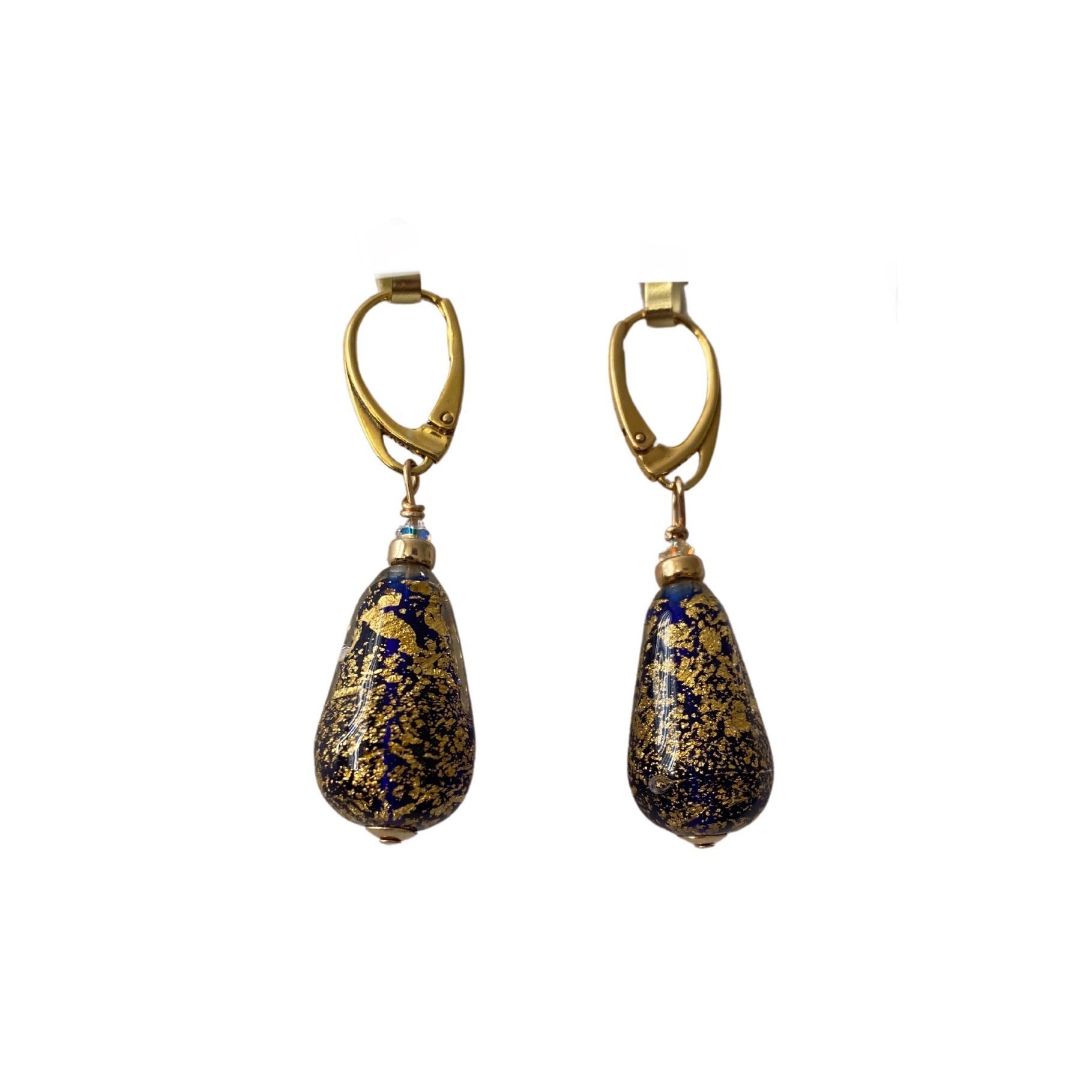 Elegant long gold and cobalt blue genuine Murano Glass teardrops (25 mm) with Gold-filled and Swarovski Crystal accents. Black transparent glass is fused with 24 Karat Gold foil - creating a glitter effect. They hang on 18 KT Gold dipped Sterling Silver lever back clasps.