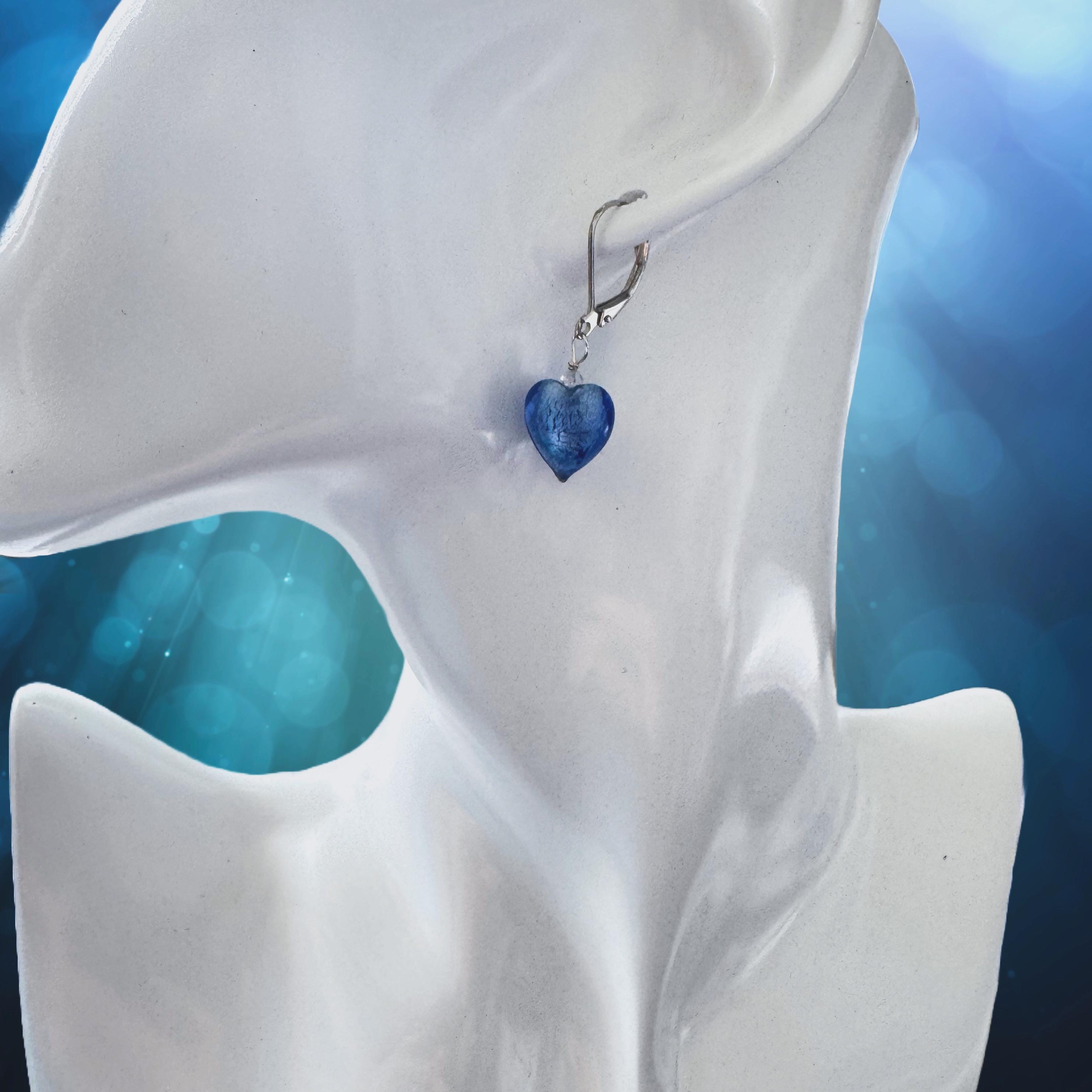 Small little ice blue heart (12 mm) earrings. White 24 karat gold foil fused inside. Sterling Silver or Gold filled lever back hooks. 14 KT Gold filled or Sterling Silver bead accents. Choose your preference.
