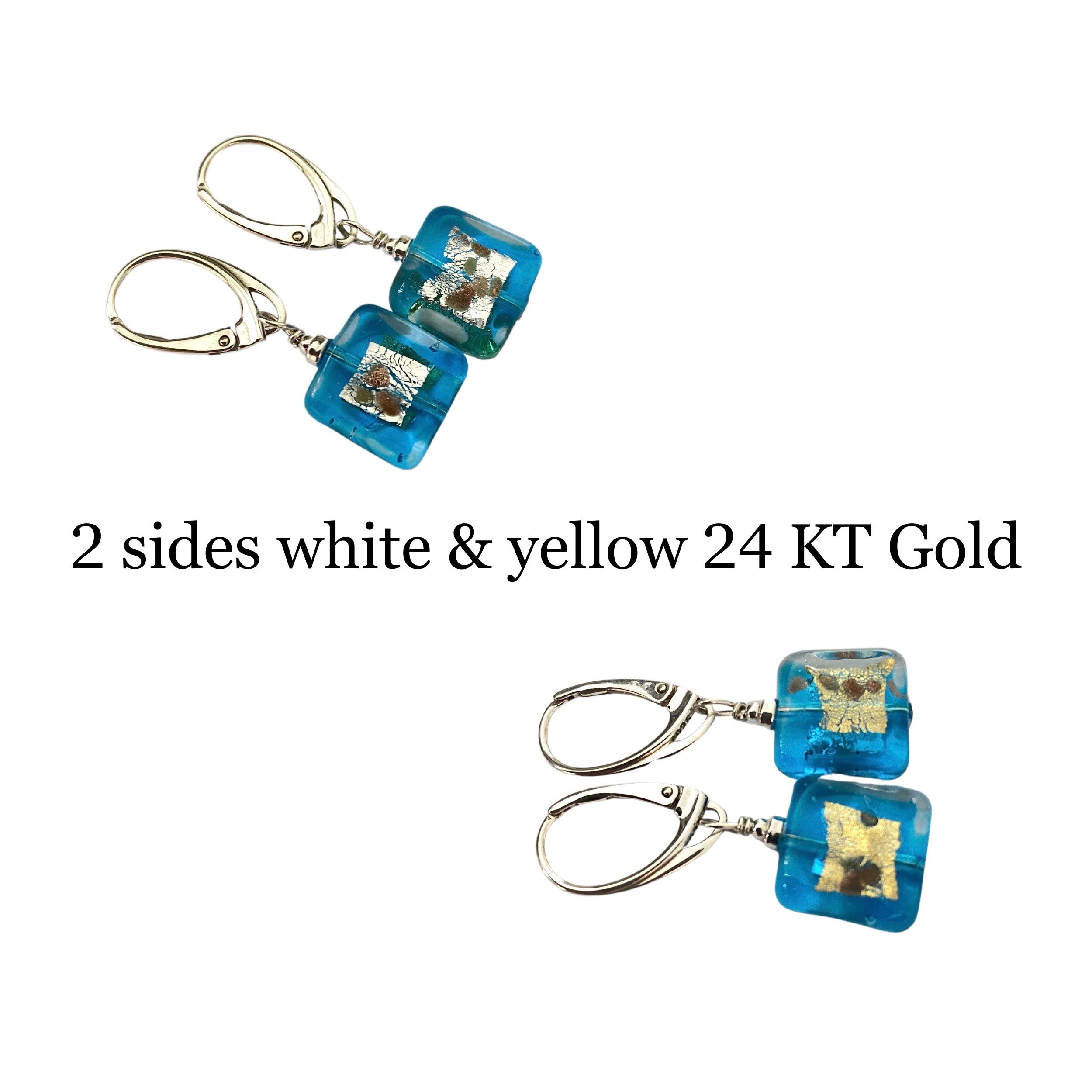 Square clear Aqua Murano Glass with splashes of 24 KT white & yellow gold and specks are Aventurine gemstone. No 2 pieces are the same, even in earrings. Different on each side.
