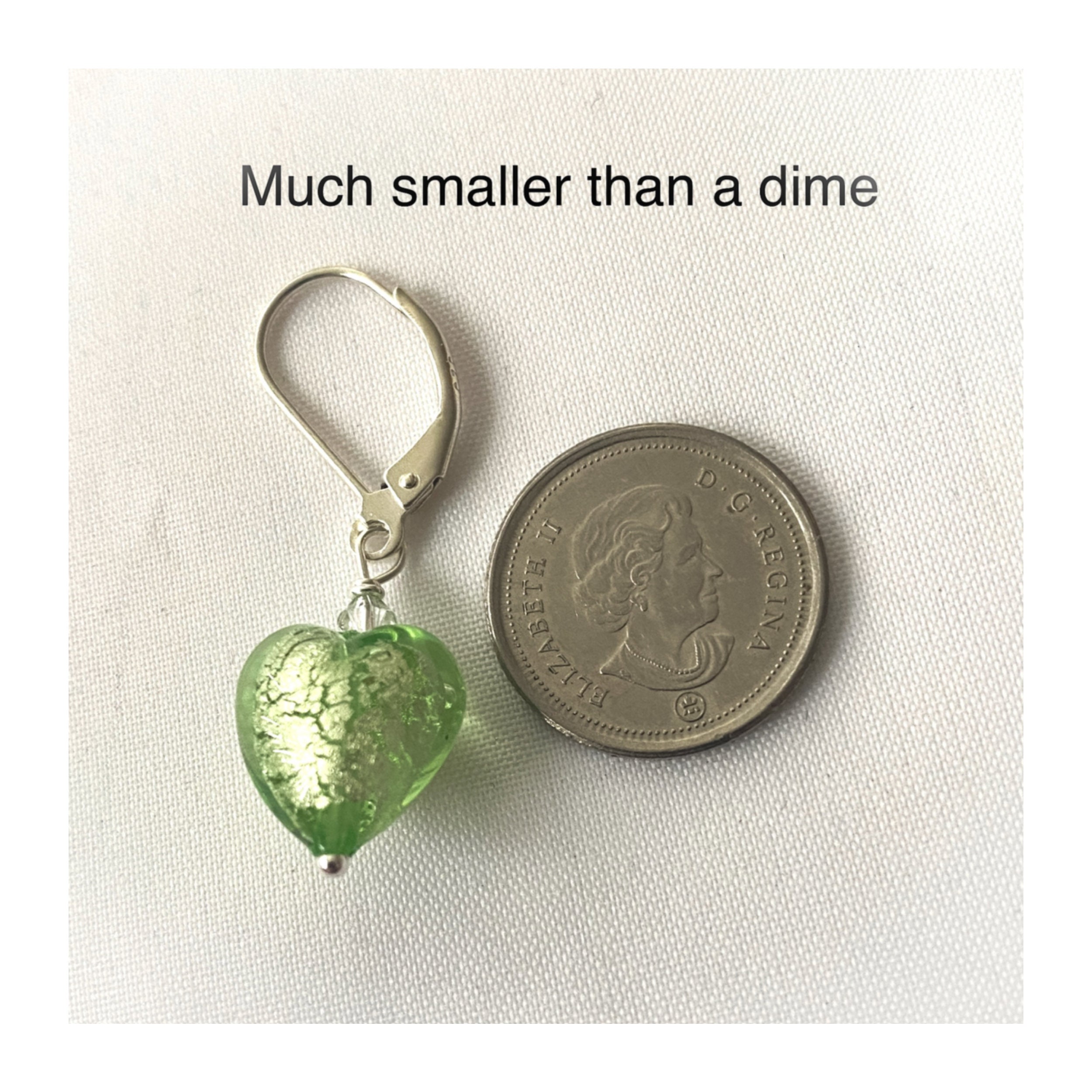 Small little light green heart earrings. White 24 karat gold foil fused inside. Sterling Silver lever back hooks. Swarovski Crystal beads. 12mm smaller than a dime coin.