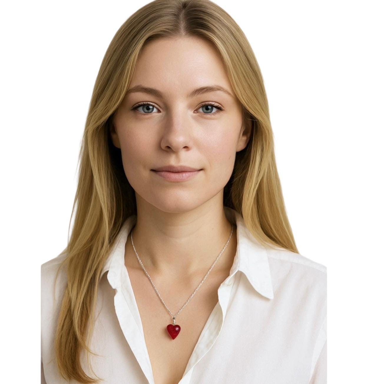 US Tariffs paid by us - no extra $$ for you! Small Ruby Red genuine Murano Glass heart pendant. Size 14mm (size of a dime) -less than half an inch. Choose your length. Austrian Crystal bead accents. Choose a Sterling Silver or gold Sterling Silver chain.