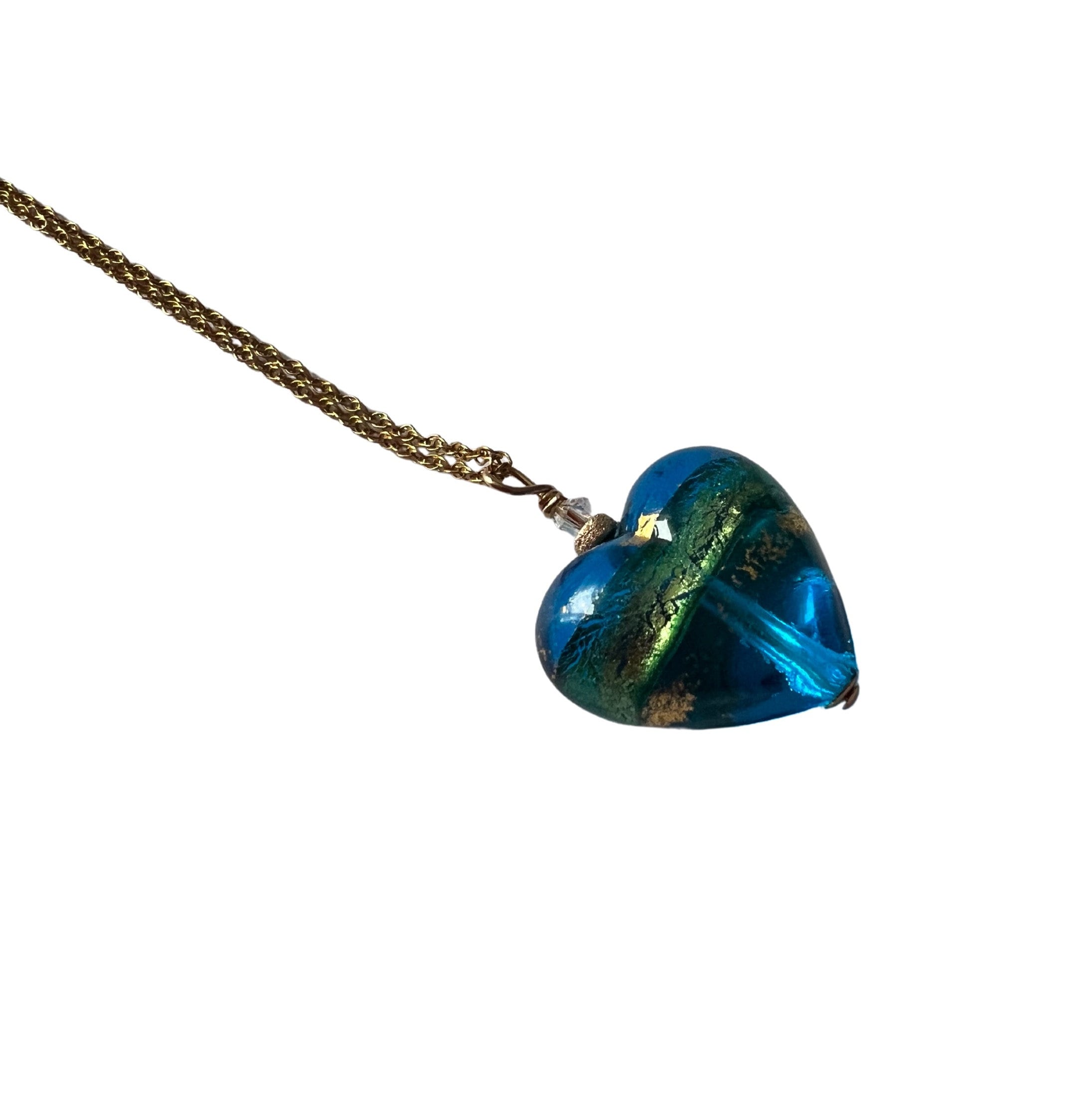 Clear Teal Blue striped genuine Murano Glass heart. Crystal and 14 KT Gold bead accents. Handmade and wire-wrapped. Small size available. Hangs on an 18 KT Gold dipped Sterling Silver chain.