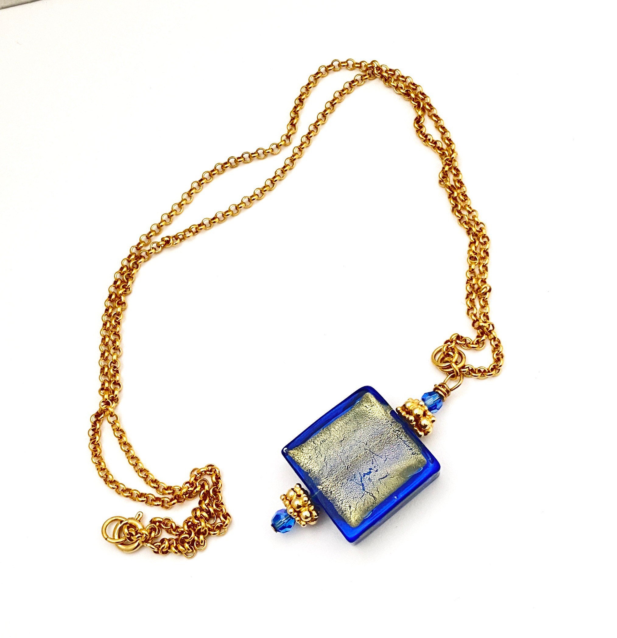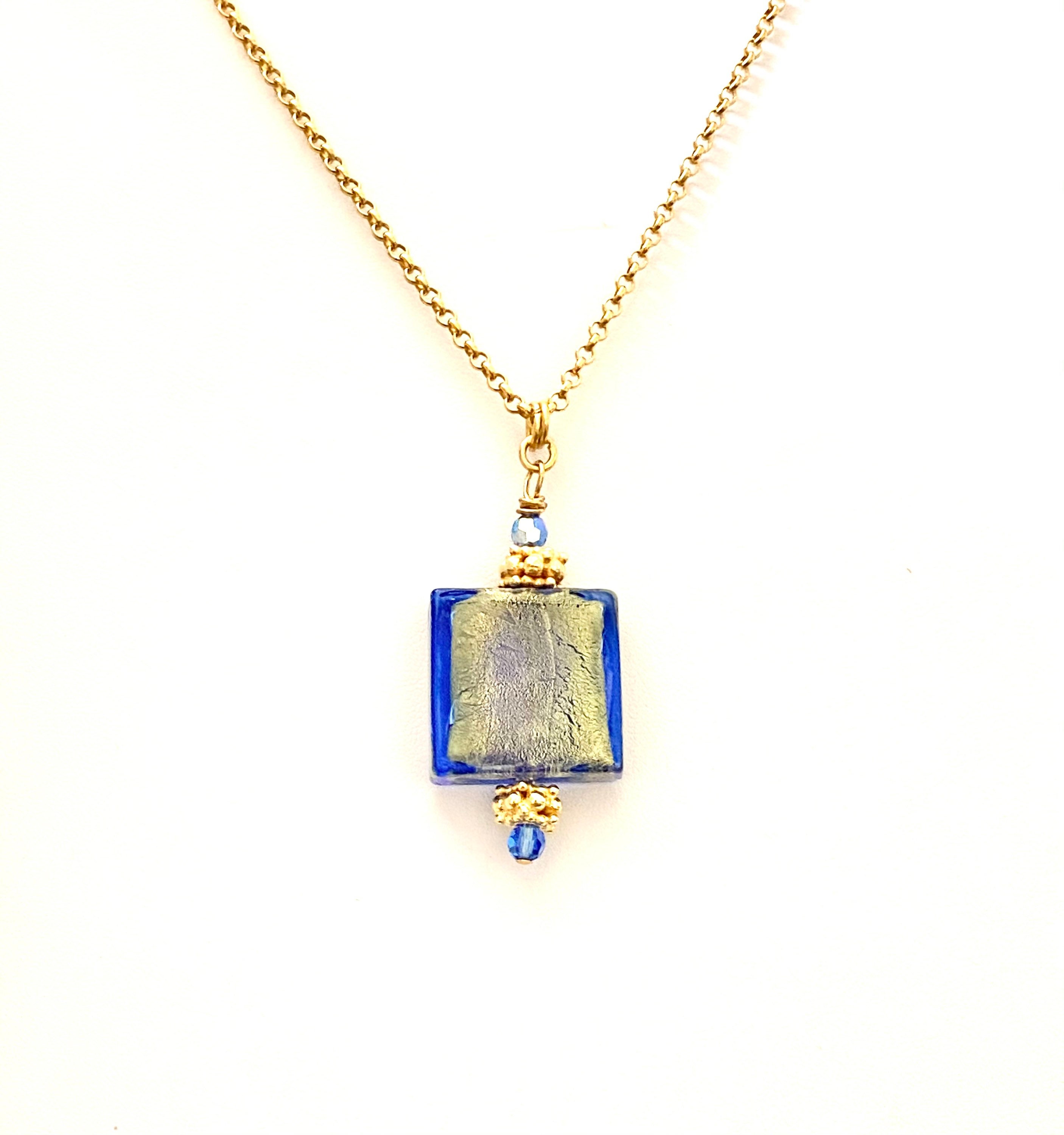 Gold Blue Square Murano Glass pendant with Gold Vermeil and Swarovski Crystals accents beads.