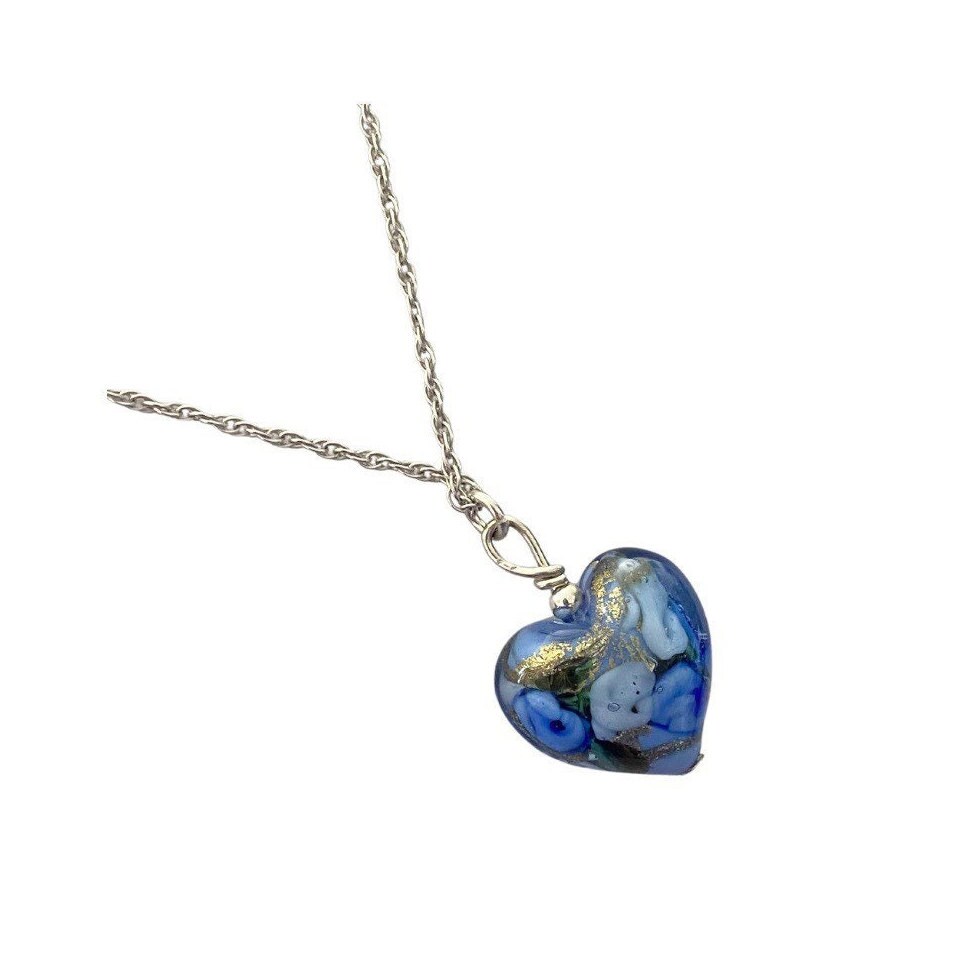 Blue Rose Murano Glass Heart necklace. Victorian inspired rose pendant comes in pink, violet and aqua colours as well. Size 16-17 mm ( smaller than a nickel) - 3/4 inch. Hangs on a 925 Sterling Silver twist style chain. Austrian Crystal bead accent.