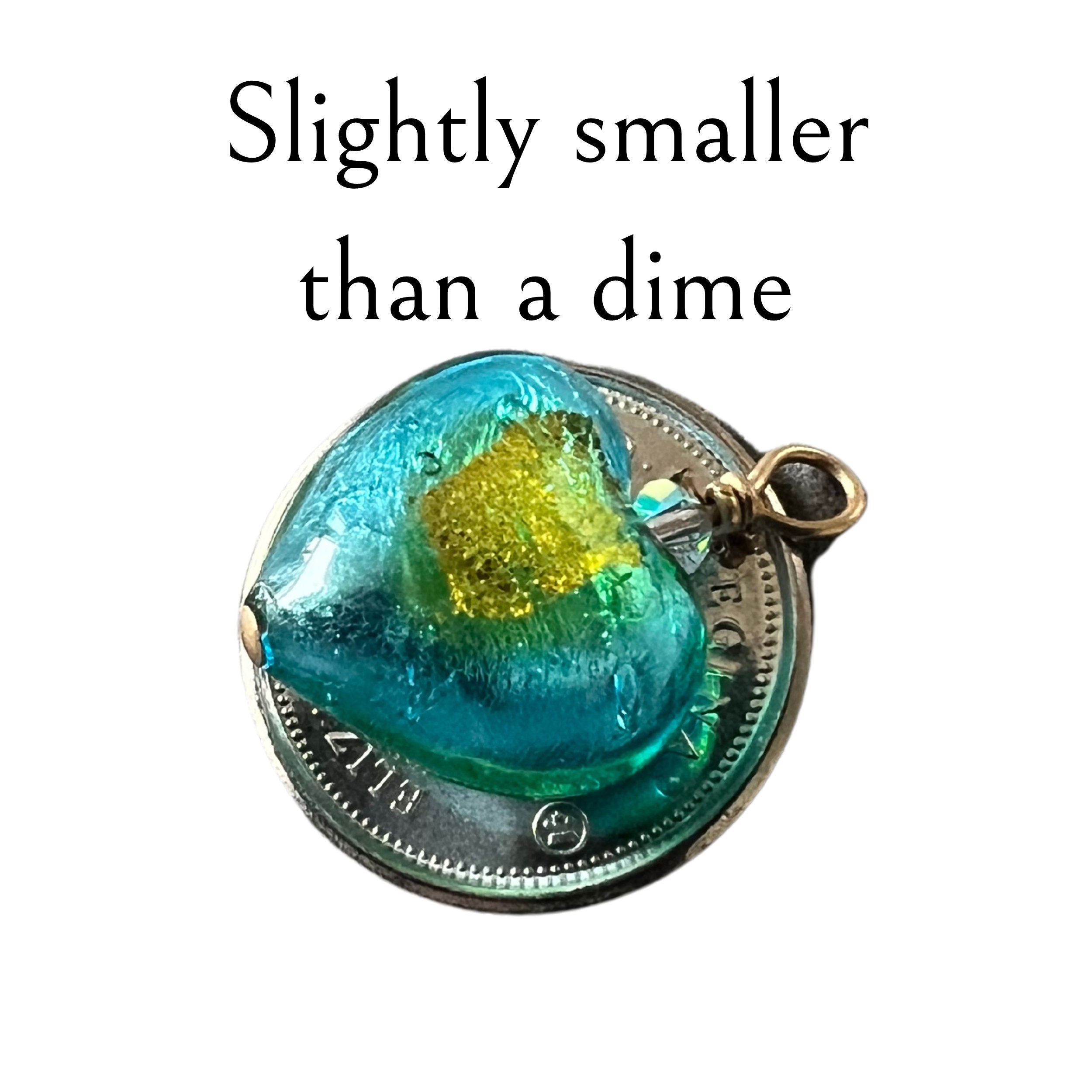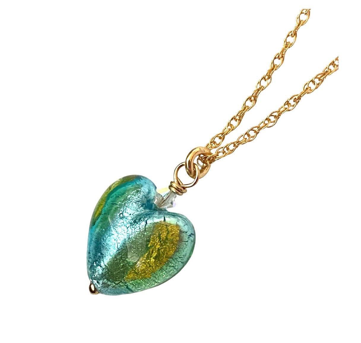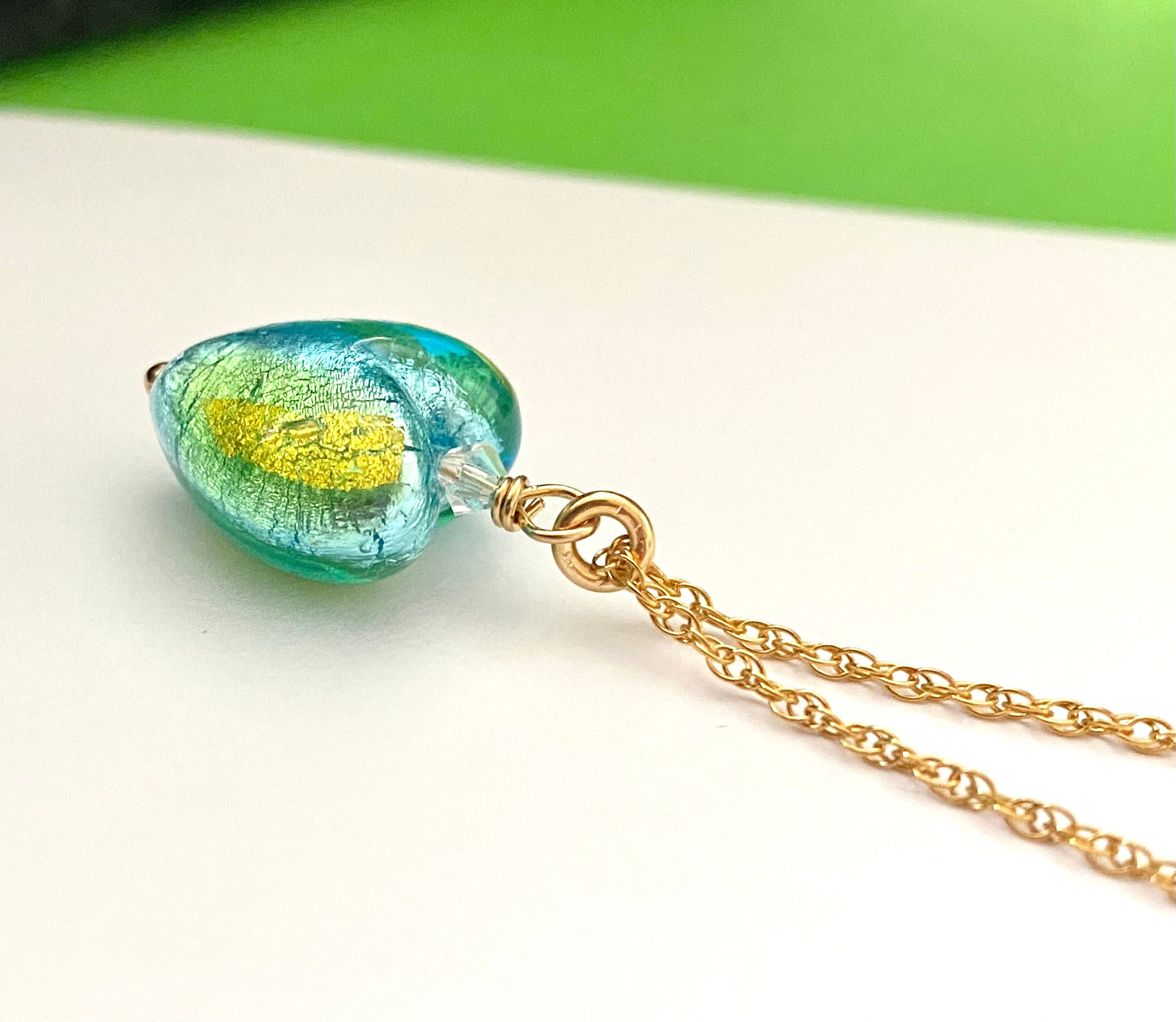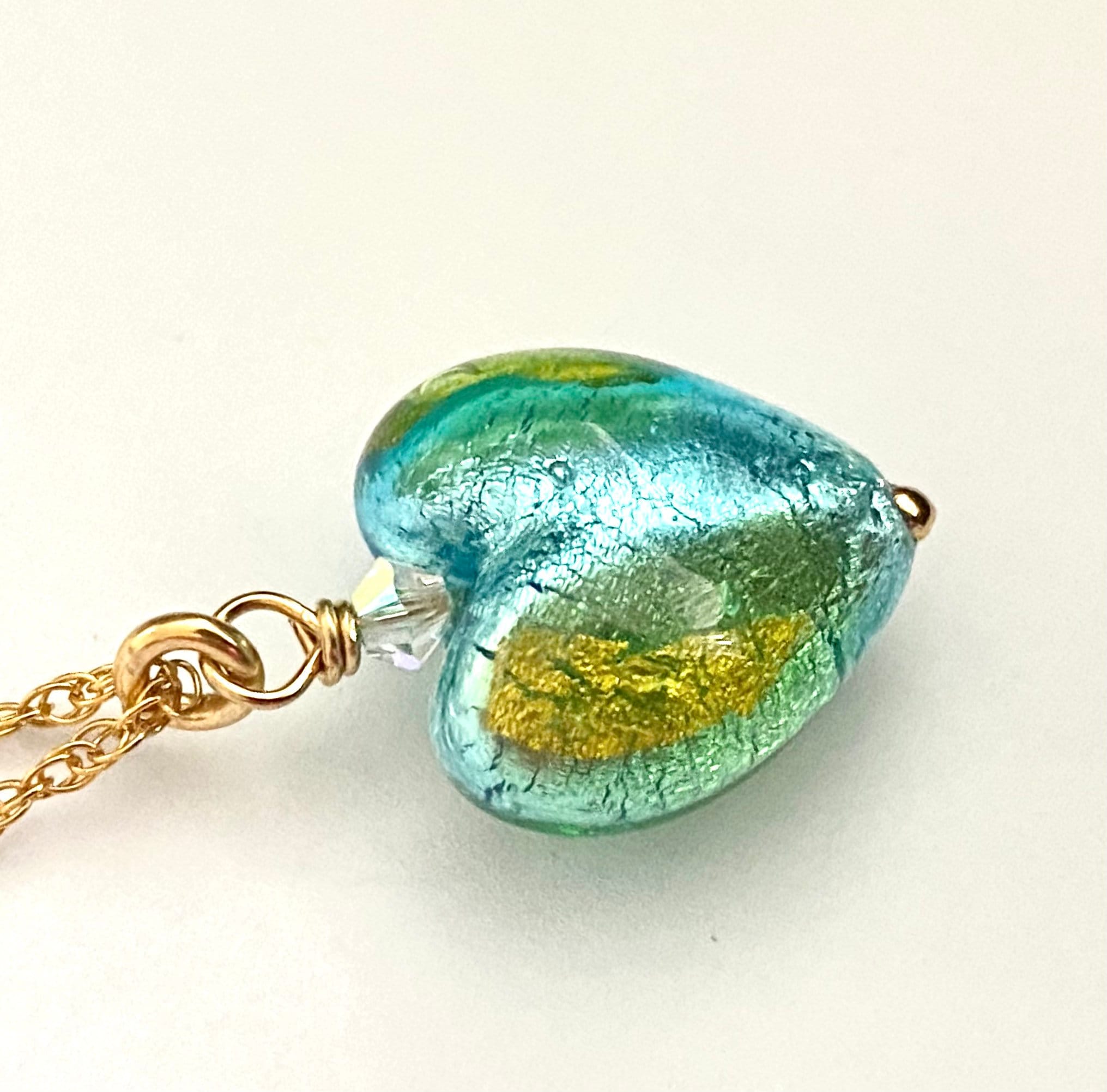 Teal green and gold Murano Glass heart pendant. Fused with real 24 Karat Gold foil splash.