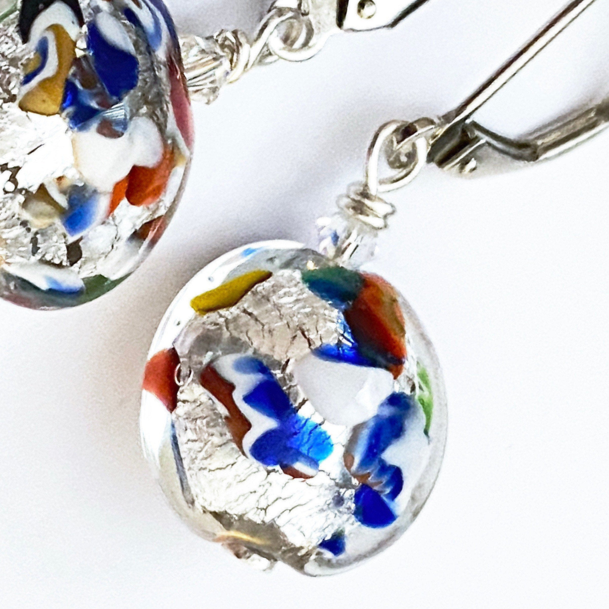 Genuine Murano Glass earrings. Sterling Silver foil Klimt tile inspired pattern. Discs are 14mm in diameter ( like a dime)- approximately 1.1 inches. Sterling Silver lever back hooks.